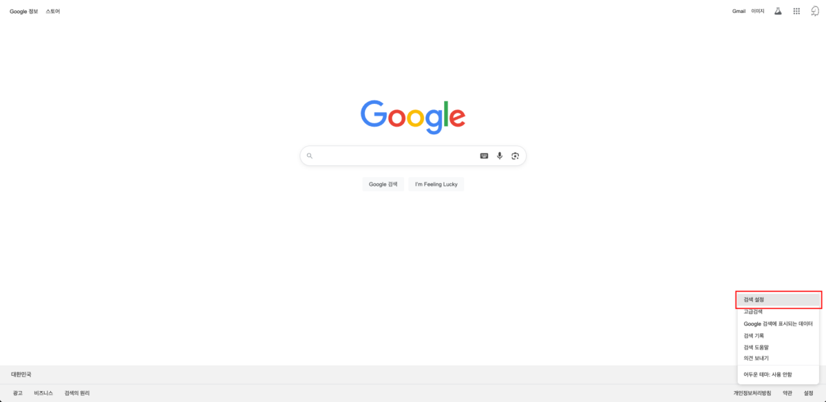 구글 우측 하단 ‘설정’ 항목을 클릭한 뒤, ‘검색 설정’ 메뉴로 이동합니다.