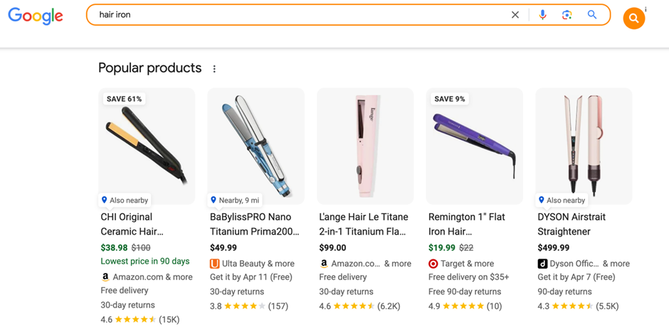 구조화된 데이터 마크업을 통해 노출된 콘텐츠는 일반 블루 링크에 비해 시각적으로 훨씬 더 강화된 경험을 줍니다. 가령 ‘hair iron’이라는 제품에 대해 제품명만 나열된 검색결과보다, 이미지와 가격, 리뷰 수와 별점 등이 함께 제공된 검색결과가 사용자에게 더 매력적이겠죠. 그리고 기본적인 정보를 인지하고 클릭한 고객인 만큼 전환가능성 또한 더 높을 것입니다. 실제로 구글 검색센터에서 밝힌 자료에 의하면, 리치 결과로 표시되는 페이지의 클릭률이 일반 검색결과로 표시되는 페이지보다 82% 더 높았다고 합니다.