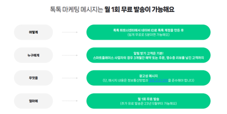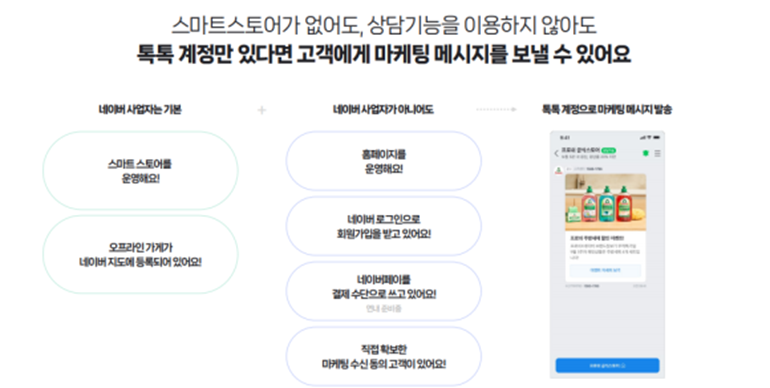 또 다른 대표적인 채널인 네이버에서도 톡톡 마케팅 메세지를 활용해볼 수 있습니다. 꼭 스마트스토어 운영 하지 않아도 오프라인 가게가 네이버 플레이스에 등록만 되어 있다면 네이버 이용 고객을 대상으로 자사 마케팅 메신저를 발송 해볼 수 있습니다.