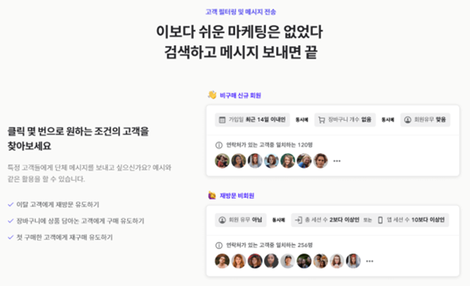 자사 데이터를 활용하기 어렵거나 내부에 쌓여 있는 데이터보다 더 넓은 데이터를 활용해 개인화된 메세지 발송해야 한다면 외부 데이터를 활용한 메신저 발송, 코어 타깃 문자 광고를 활용해볼 수 있습니다.