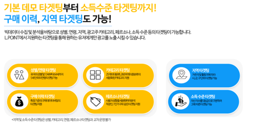 이는 각 카드사, 통신사별 마케팅 수신 동의 고객에게 각 카드통신사별 보유 데이터를 기반으로 자사 브랜드 잠재 고객을 찾을 수 있도록 핵심적인 타깃을 추출해 마케팅 메시지를 발송하는 광고 형태입니다. 카드사는 각 카드사별 기본 인구통계(나이,성별,지역 등)와 더불어 카드사 및 카드사 제휴 업체 등의 결제 데이터를 기반으로 모수를 추출해 원하는 광고 형태(LMS,MMS,RCS,카드사 관련 제휴 앱푸쉬)로 문자 발송 가능합니다.