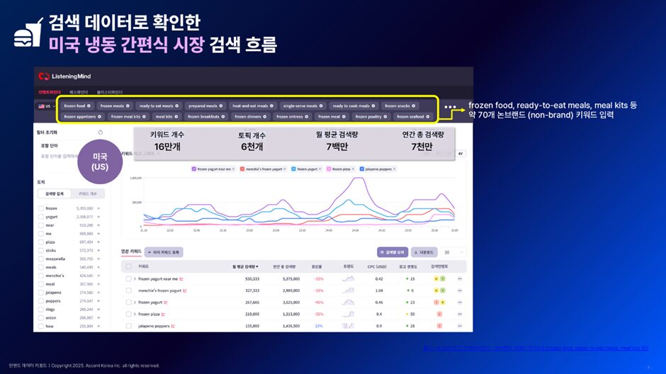 미국은 전 세계에서 냉동식품과 간편식 시장 규모가 가장 큰 국가 중 하나입니다. ‘Frozen food’ ‘Ready-to-eat meals’ ‘Meal kits’ 등 약 70여 개의 논브랜드 키워드를 수집한 결과, 미국 내 관련 연관 키워드는 약 16만 개, 월평균 700만 회, 연간 약 7000만 회의 검색이 발생하는 것으로 확인되었습니다.