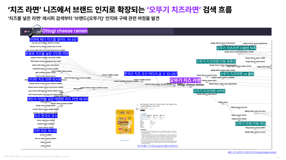 특히 ‘Ottogi cheese ramen’의 검색 경로 분석에서는 ① 조리 아이디어(레시피·치즈 라면) → ② 브랜드 검색(오뚜기 치즈라면) → ③ 유통 및 콘텐츠 채널(TikTok·YouTube·H Mart)로, 인지-관심-탐색으로 이어지는 자연스러운 검색 전환이 관찰되었습니다. 이를 통해 소비자 인지 흐름에 맞춘 콘텐츠 채널 전략 설계의 중요성을 확인할 수 있습니다.