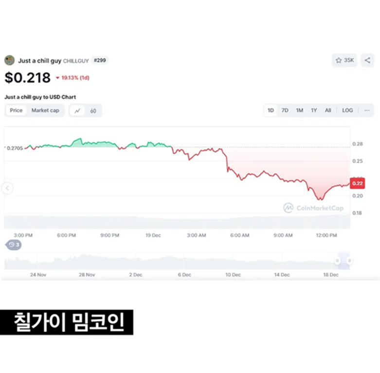칠 가이 밈은 해외에서 크게 유행하더니 지난 11월, 도지코인과 같은 “CHILLGUY” 밈 코인으로 등장하기도 했어요. 이 코인은 발행 직후 시가총액이 6억달러(한화 약 8800억 원)까지 오르며 떡상을 기록했죠. 그러나 칠 가이 원작자인 필립 뱅크스가 “내가 만든 캐릭터가 상업용으로 쓰이길 원치 않는다. 이를 통해 수익을 얻고 있는 사람들에게 법적 조치를 취하겠다”라고 밝힌 뒤, 가격이 1억달러로 급락하기도 하며 논란이 되기도 하였어요.