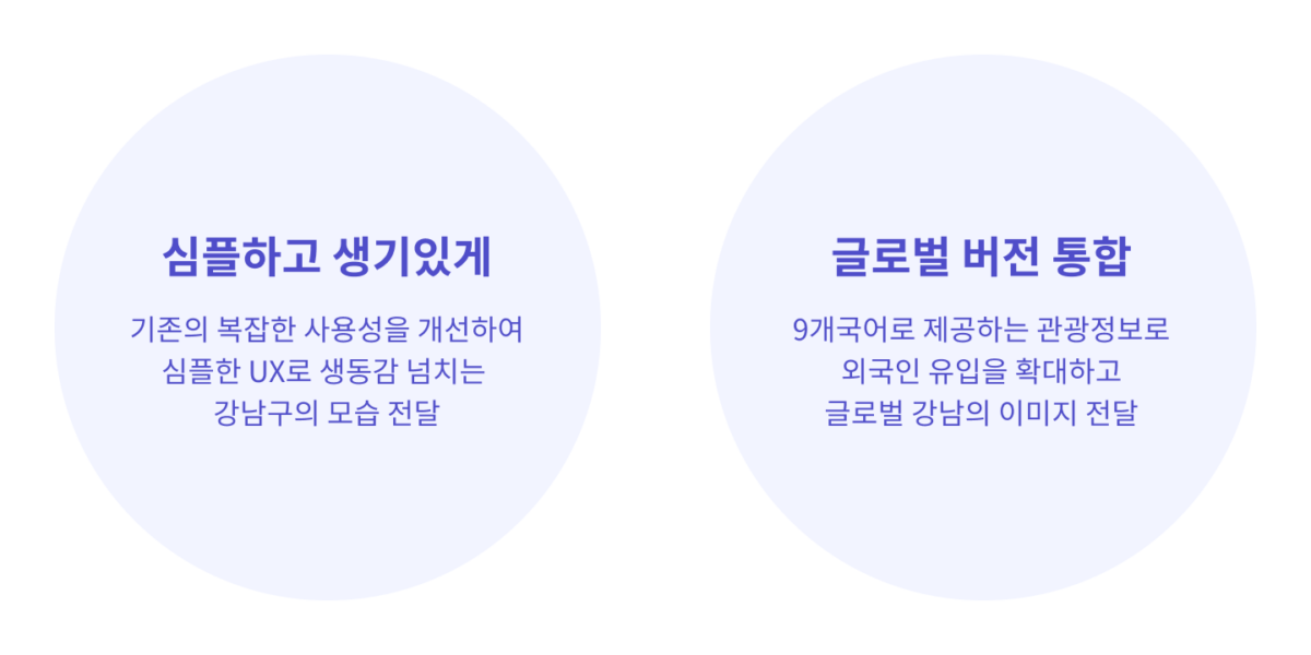 ‘별별강남’은 사용자의 편의를 증진하고 스마트 도시 생활의 핵심이 되는 강남구의 공공 모바일 플랫폼입니다. 기존의 ‘더강남’에서 ‘별별강남’으로의 브랜드 리뉴얼과 함께 UX/UI 개선 프로젝트를 진행하였습니다. 기존에 가지고 있던 문제점을 개선하고, 신규 서비스를 통해 글로벌 관광 정보를 제공하며 실시간 정보 제공을 통해 ‘별별강남’만의 신뢰감, 편리함, 유용함을 전달할 수 있도록 개선하였습니다.