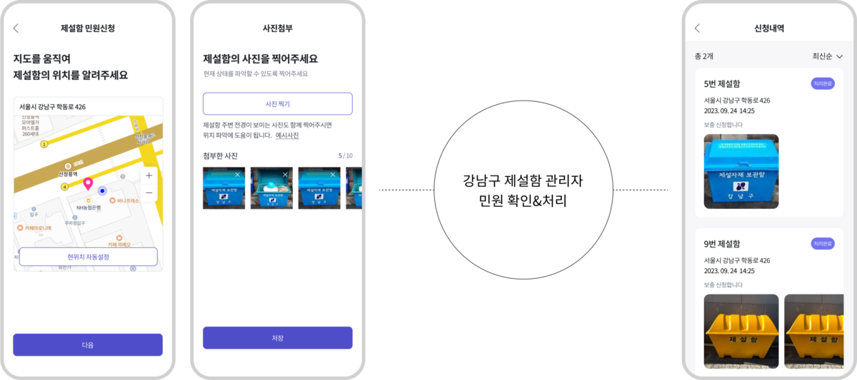 직관적인 지도 UI를 통해 사용자는 주소를 몰라도 제설함의 위치 정보를 입력할 수 있고 연령대가 넓은 사용자층을 고려하여 한 페이지당 한 가지의 질문을 배치하는 친절하고 간결한 방식으로 설계했습니다.