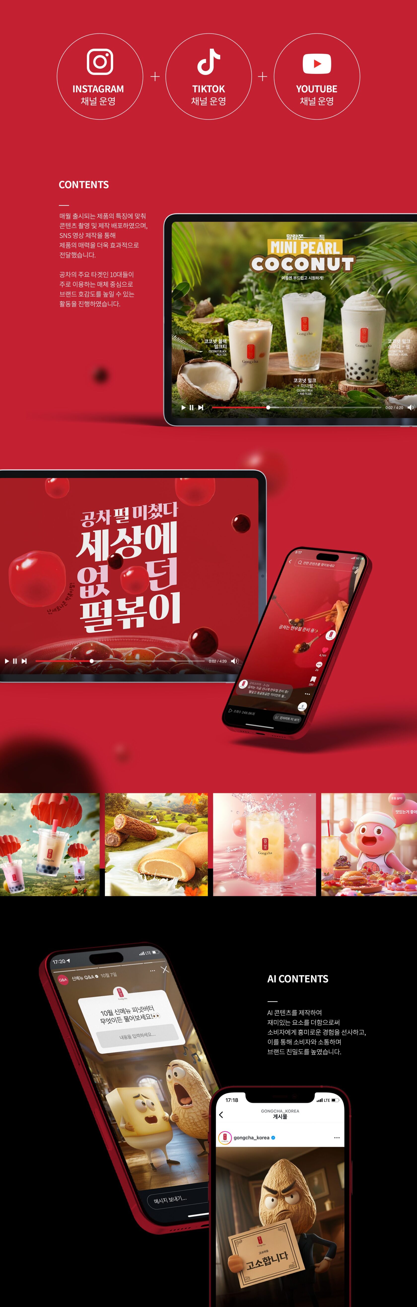 매월 출시되는 제품의 특징에 맞춰 콘텐츠 촬영 및 제작 배포하였으며, SNS 영상 제작을 통해 제품의 매력을 더욱 효과적으로 전달했습니다. 공차의 주요 타겟인 10대들이 주로 이용하는 매체 중심으로 브랜드 호감도를 높일 수 있는 활동을 진행하였습니다.