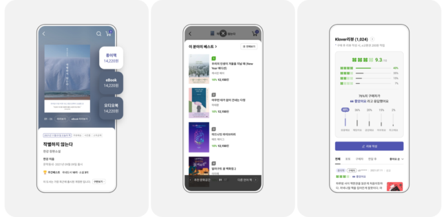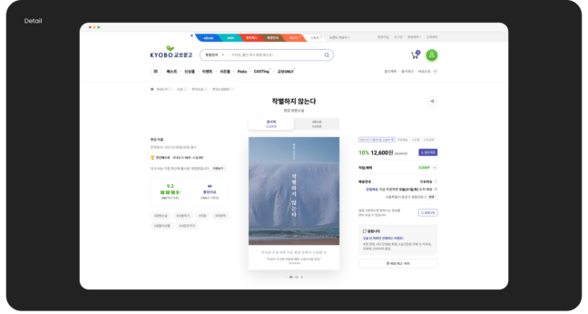 상품 상세 화면에서는 도서정보와 구매정보를 분기하여 구성하고, 동일 콘텐츠의 다른 상품 (종이책,이북, 원서번역서)으로 쉽게 이동할 수 있되 리뷰는 통합 제공하여 효율적이고 매끄러운 상품탐색이 가능 하도록 구성 했습니다.