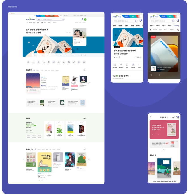 교보문고는 NO.1 도서쇼핑몰로 전자책, 음반, 기프트, 문화서비스를 제공하는 종합문화기업입니다. 이제 디지털 혁신을 통해 미래지향적인 새로운 서비스와 상품을 제공하고 디지털 브랜드로 파워업하기 위해 리뉴얼 프로젝트를 진행하였습니다. 교보문고만의 정직하고 바른 이미지를 유지하면서도 개성적인 아이덴티티를 담은 트렌디함을 지향하였습니다.