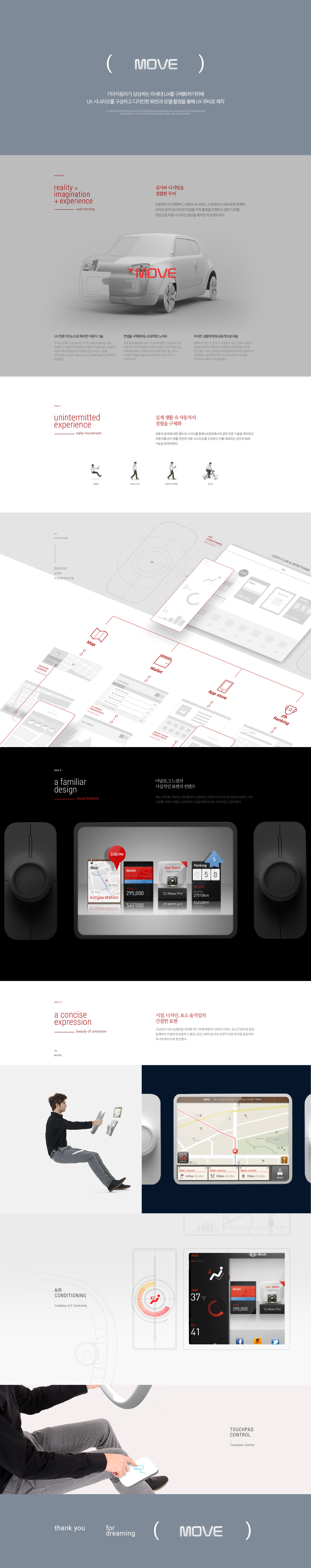기아자동차의 차세대 UX를 구체화하는 프로젝트로, 사용자 시나리오를 기반으로 한 AVN 기능 정의와 화면 설계 작업을 진행했습니다. 이 프로젝트는 자동차와 일상 생활 속 경험이 어떻게 이어지는지 구체화한 후, 이를 실사 촬영과 디지털 작업을 결합해 UX 무비로 표현한 작업입니다. 또한, 친숙한 GUI를 적용하여 아날로그 느낌의 현실적인 표현을 사용하고, 절제된 표현 기법으로 가상 공간에서의 실재감을 극대화했습니다.
