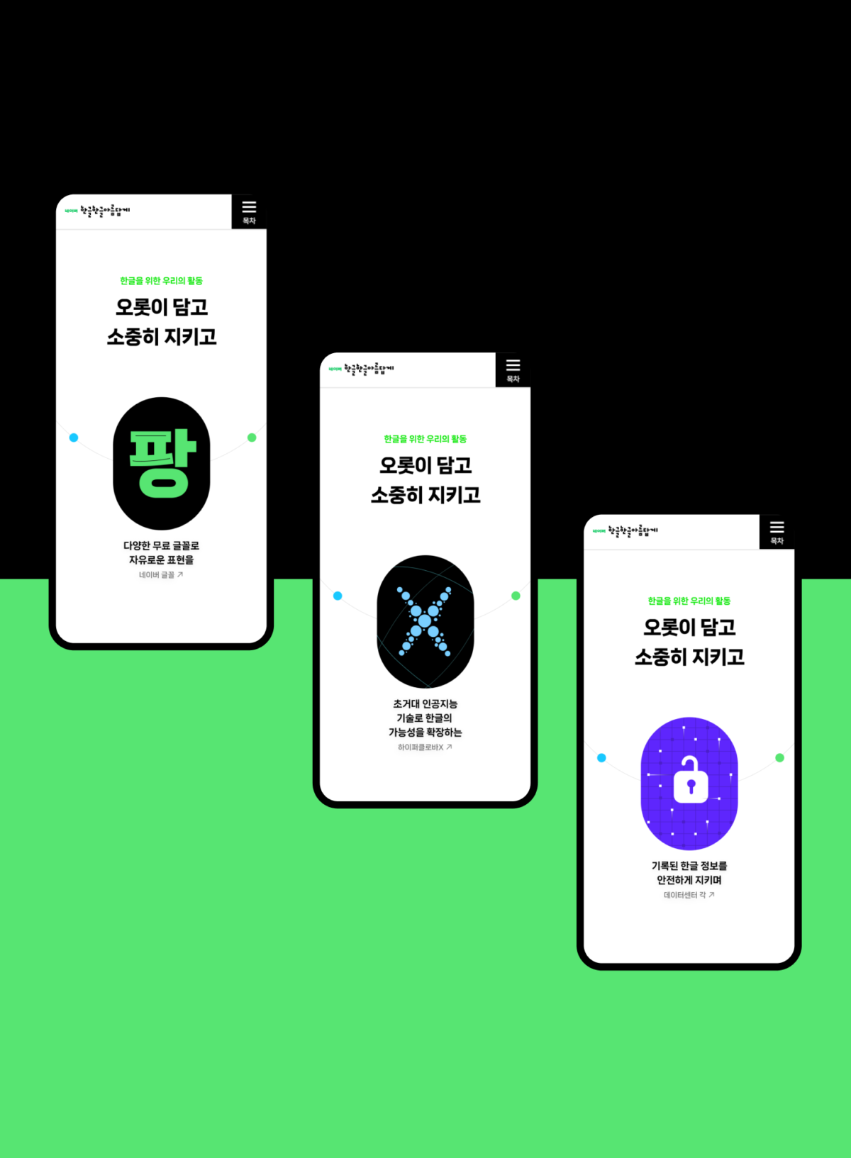 올해로 15주년을 맞은 이번 ‘네이버 한글한글 아름답게 캠페인’ 프로젝트에서는 오랜 기간 개인의 한글 기록으로 성장해 온 ‘디지털 한글 생태계’에 주목했습니다. 개인의 한글 기록이 ‘디지털 한글 생태계’를 성장시키고 의미 있는 유산으로 한글의 미래를 만드는 원동력이 된다는 의미와 가치를 전달하고자 했습니다. 이와 함께 개인 한글 기록이 담고 있는 온기와 시대적 공감도 함께 나누고자 했습니다. ‘한글’이라고 하면 떠올리게 되는 기존의 고전적이고 정적인 이미지를 벗어나 미래 지향적인 그래픽과 영상으로 한글의 미래를 표현하고자 했습니다. 다소 어려울 수 있는 ‘디지털 한글 생태계’의 의미를 쉽게 전달하면서 네이버의 다양한 한글 관련 활동을 자연스럽게 선보이기 위해 단순한 클릭과 상하 스크롤링만으로 둘러볼 수 있도록 캠페인 페이지를 간결하게 구성하였습니다. 또한, 사전 캠페인을 통해 모인 이용자들의 한글 이야기와 박물관에서 수집한 100여 개의 한글 기록을 ‘클로바 더빙’과 ‘클로바X’로 생성된 AI 콘텐츠와 함께 전시하여 이번 캠페인을 통해 한글의 미래를 직접 경험할 수 있도록 했습니다. 한글날 기념 캠페인 취지에 맞춰 한자어 사용은 줄이되 일상적 언어로 표현하여 이용자들로 하여금 생활 속 한글 사용이 한글 발전에 기여해 왔다는 사실을 환기시키고자 했습니다.