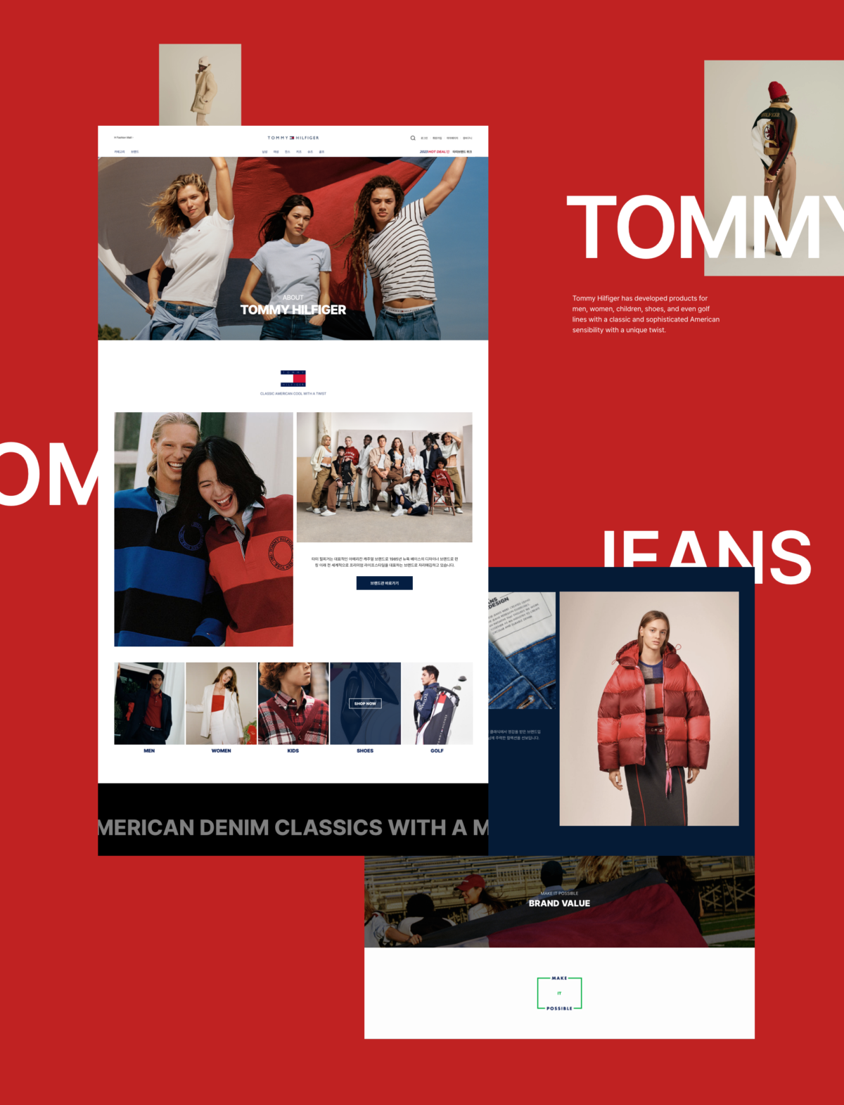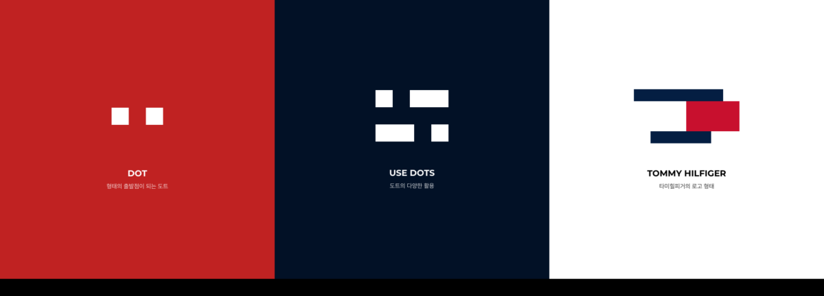 글로벌가이드를 준수하여 타미힐피거만의 브랜드 이미지를 통일성 있게 전달하며 조형적인 형태의 출발점이 되는 도트의 확장과 로고의 쉐잎을 표현하는 사각 형태를 활용하여 다양한 패션, 패션의 시작을 상징하는 타미힐피거를 표현합니다.