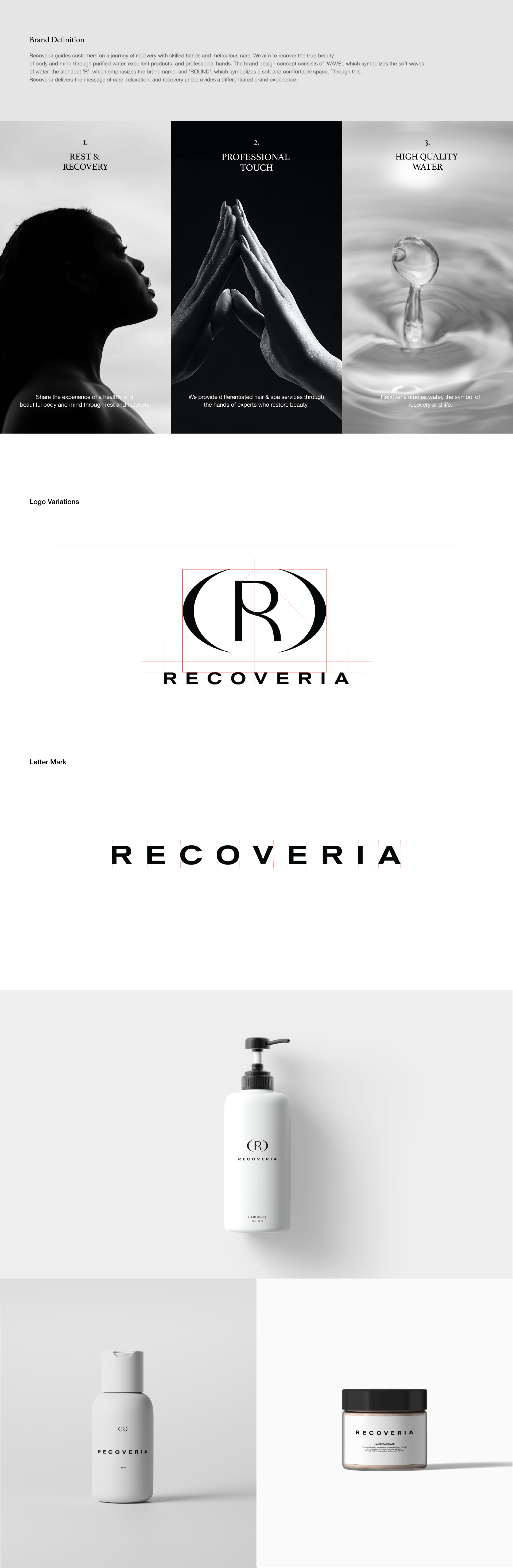 리커버리아는 숙련된 손길과 세심한 배려로 고객들에게 회복의 여정을 안내하는 공간입니다. 단순히 미용 서비스에 그치지 않고, 정제된 물, 우수한 제품, 전문적인 손길을 통해 몸과 마음의 진정한 아름다움을 회복하는 것을 목표로 합니다.브랜드 디자인 컨셉은 물의 부드러운 파장을 형상화한 ‘WAVE’, 브랜드 이름을 각인시키는 알파벳 ‘R’ 강조, 부드럽고 편안한 공간을 상징하는 ‘ROUND’로 구성되어 있습니다. 이러한 시각적 아이덴티티를 통해 리커버리아는 고객들에게 케어와 휴식, 회복의 메시지를 전달하며 차별화된 브랜드 경험을 제공합니다.브랜드 디자인은 서비스와 공간, 태도를 통합적으로 반영하여 조화로운 아이덴티티를 구축했으며, 고객들에게 단순한 미용을 넘어선 특별한 휴식과 회복의 가치를 전하였습니다.