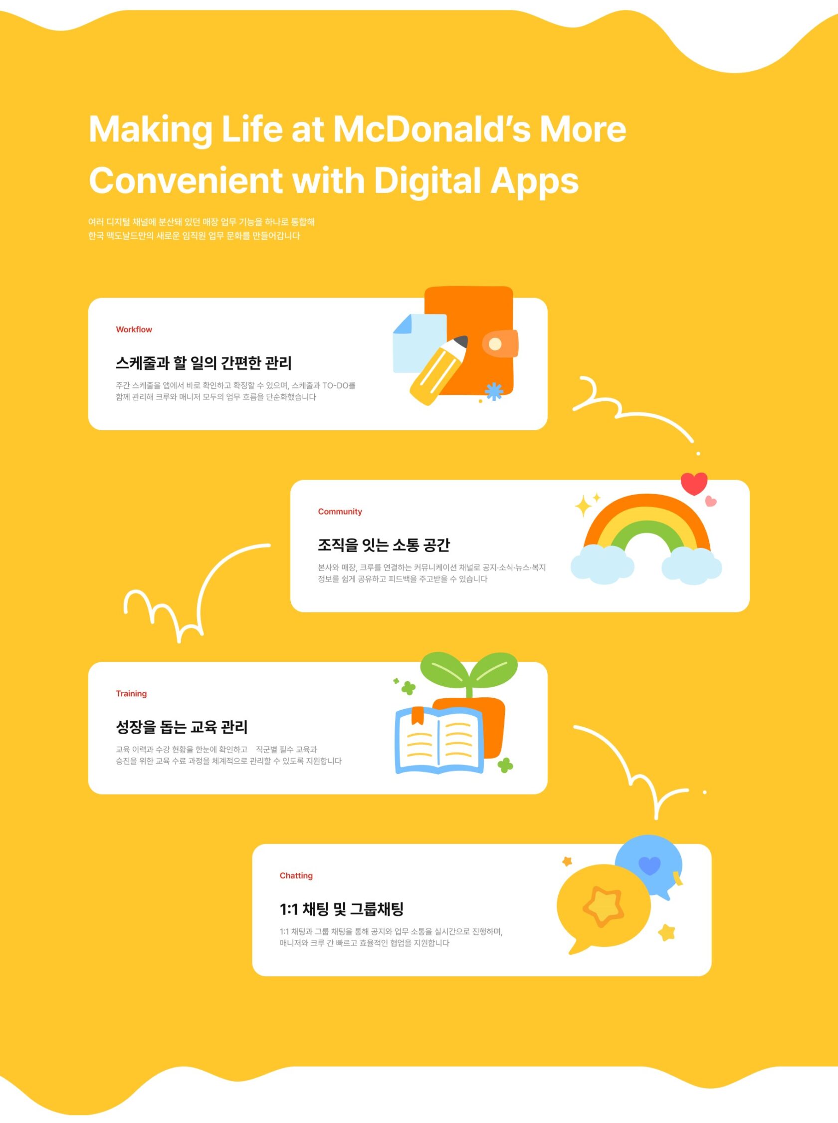 기존 맥도날드 임직원(레스토랑, 본사)의 업무 환경은 분산된 시스템과 수기 공지 및 업무 처리 방식으로 인해 효율성 증대에 대한 필요성이 대두되고 있었습니다. 또한 임직원 간 소통 채널의 확대를 통한 조직 결속 강화 필요성 또한 지속적으로 제기되어 왔습니다.이에 한국 맥도날드는 전반적인 커뮤니케이션 강화를 위한 개선 방향 수립 및 전문적인 컨설팅의 필요성을 인식하게 되었습니다.