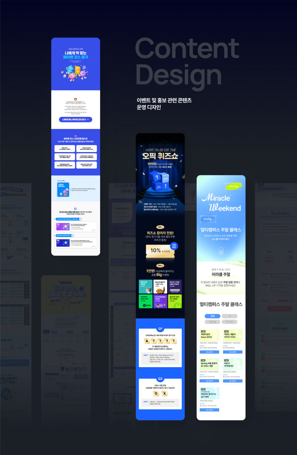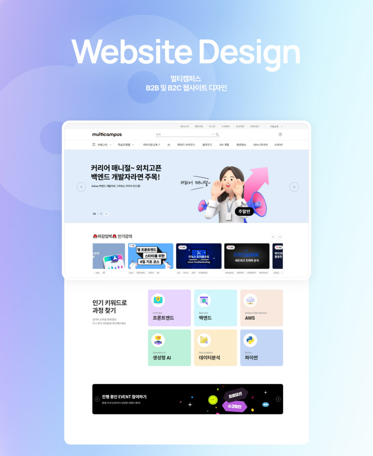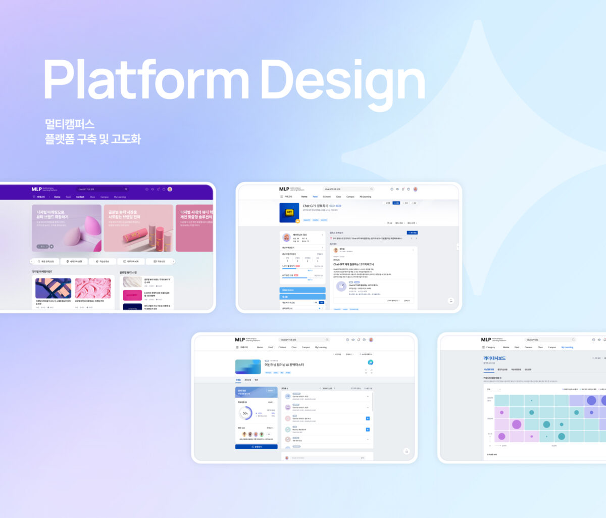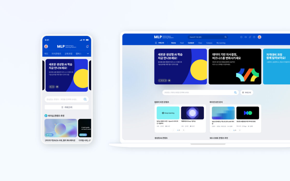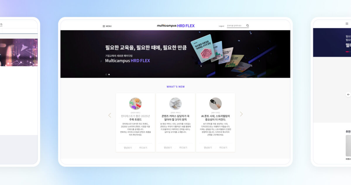CX 디자인 파트너십을 통해 멀티캠퍼스의 비주얼 커뮤니케이션을 전방위적으로 지원하고 있습니다. 주요 작업으로는 플랫폼 구축 및 고도화, 연간 콘텐츠 운영 디자인(이벤트, 홍보물, 배너 등), 연관 사업부 웹사이트 리뉴얼 등이 포함됩니다. 또한, BI 고도화, 아이콘 제작, 모션 그래픽 디자인, 영상 제작 등 다양한 시각적 요소들을 포함하여 멀티캠퍼스의 브랜드 가치를 강화하고 있으며, 다수의 국내외 어워드를 수상하는 성과를 거두었습니다.