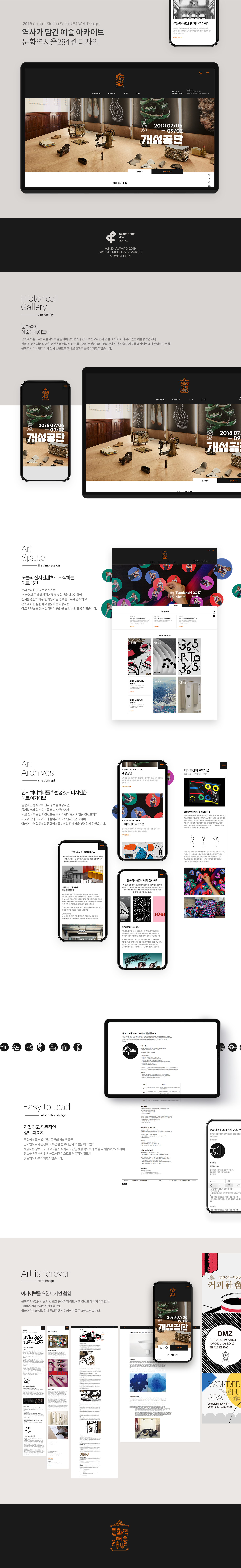 문화역서울284는 서울역으로 출발하여 문화전시공간으로 변모하면서 건물 그 자체로 가치가 있는 예술공간입니다. 따라서, 전시되는 다양한 콘텐츠의 예술적 정보를 제공하는 것은 물론 문화역이 지닌 예술적 가치를 웹사이트에 전달하기 위해 문화역의 아이덴티티와 전시 콘텐츠를 하나로 조화되도록 디자인했습니다. 전시 하나하나를 차별성있게 디자인하여 아카이브 역할로서의 문화역서울284의 정체성을 분명하게 하였습니다. 문화역서울284의 전시 콘텐츠는 80여개의 아트웍 및 콘텐츠 페이지의 운영디자인을 통해 문화콘텐츠 아카이브를 구축했습니다.