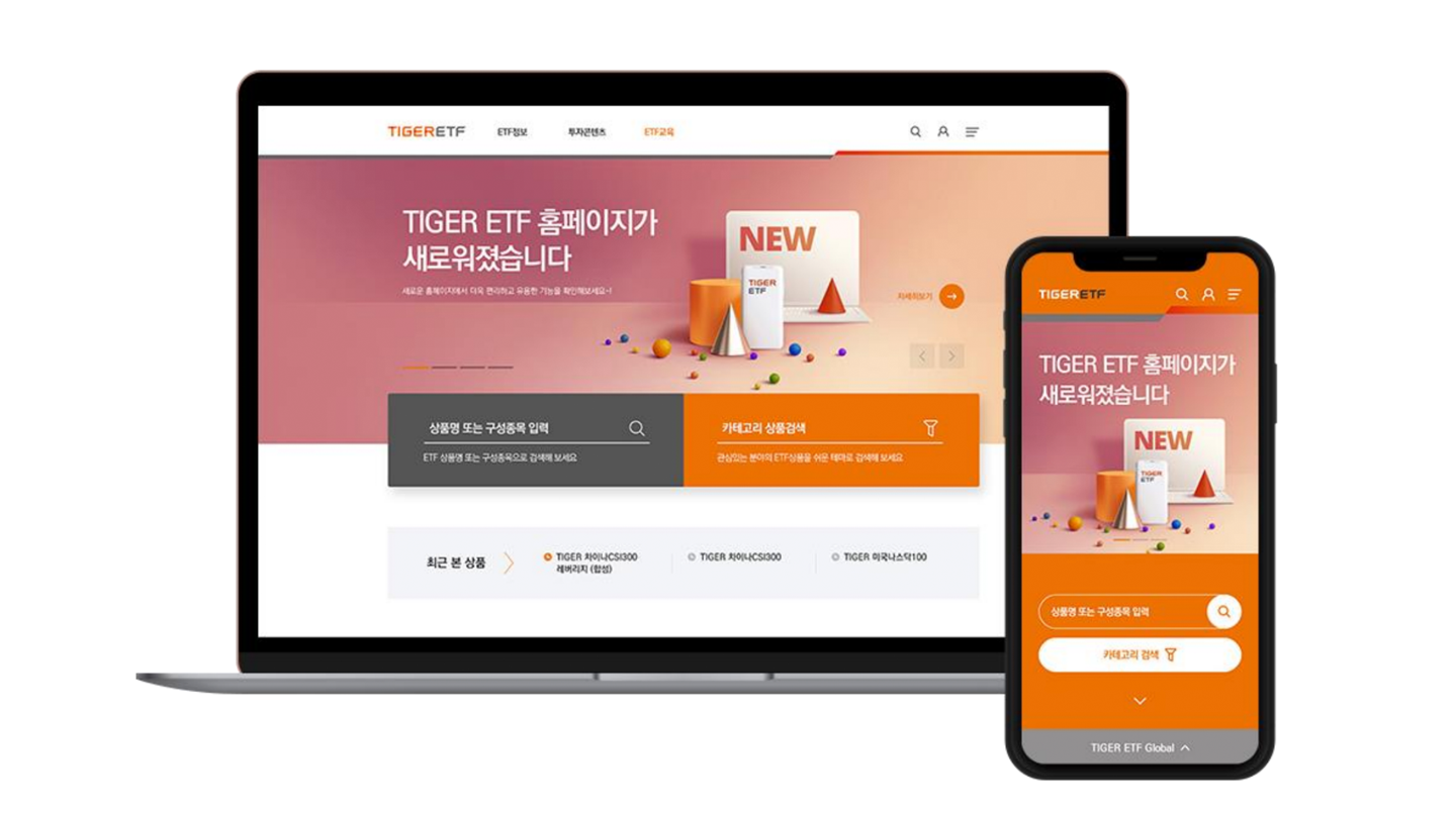 TIGER ETF는 국내에서 가장 많은 상품을 보유하고 있는 미래에셋자산운용의 ETF 브랜드입니다. 국내 경제가 장기적 저성장 기조를 보이고 개인 펀드 투자자들이 지속적으로 증가하는 상황에서, TIGER ETF는 이번 웹사이트 리뉴얼을 통해 모든 사용자가 차별 없이 투자 정보에 접근할 수 있는 환경을 구축하고자 했습니다. PC 환경이든 모바일 환경이든, 정보 접근 약자이든 아니든 투자에 관심 있는 사람이라면 누구에게나 양질의 투자 정보를 제공해 투자의 진입 장벽을 낮추고 수익 창출을 돕고자 했습니다.