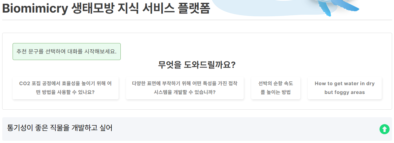 최근 지속가능한 발전을 위한 동력으로서 주요 산업 부문(소재, 환경 및 오염처리, 제약 및 화학 등)을 중심으로 생태모방(인간 사회의 기술·공학적 문제 해결을 위해 생물자원의 기본 구조, 기능 및 원리를 모방·응용하는 것)의 중요성이 주목받고 있다. 그러나 종전의 생태모방 연구는 산업 분야의 기술적 문제에 대한 해법을 생물·생태 특성으로부터 찾고자 하는 방식이 주류였으나, 학문적 간극으로 인해 기술·공학자들이 필요로 하는 생물· 정보에 접근하는 데에 제약 발생하는 등 방대한 생물·생태 특성 원리 중에서 실제로 기술 개발로 이어진 사례는 극히 일부에 불과하였다. 이에 생태모방 연구 및 기술 개발 촉진을 위해 생물·생태 특성 정보를 체계화시켜 제공하는 정보시스템의 필요성이 제기됨에 따라 생태모방 연구, 기술 개발 및 실용화에 효율적으로 활용 가능한 수요자 맞춤형 생태모방지식 서비스 플랫폼을 구축하여 서비스하게 되었다.