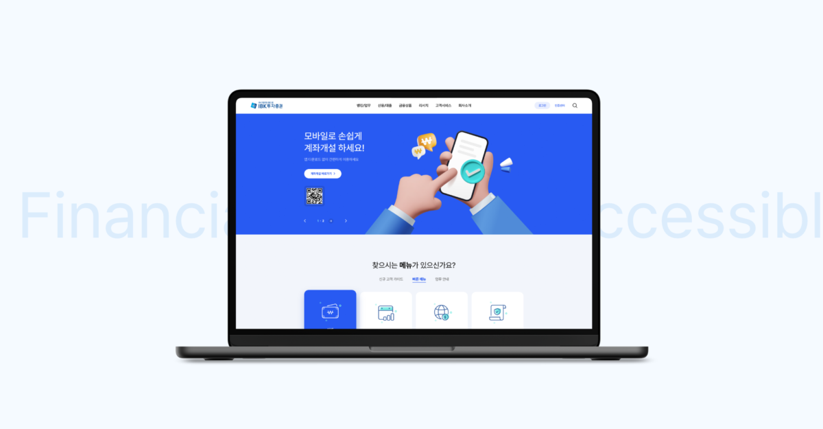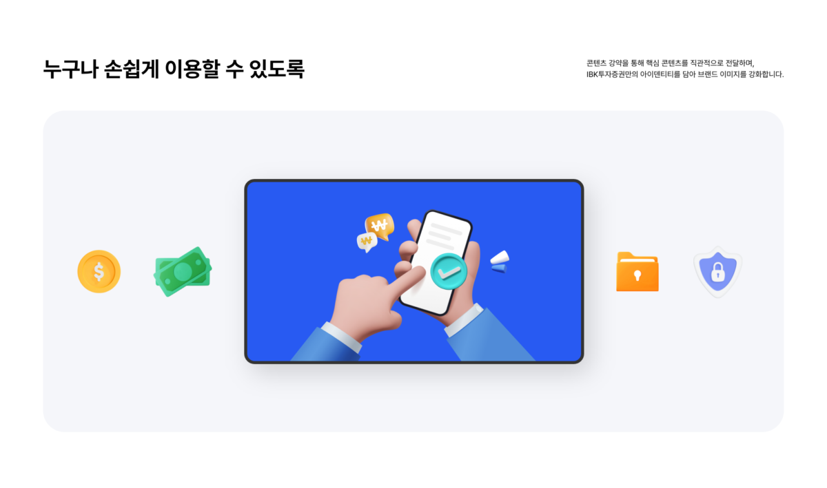 복잡한 금융 서비스를 누구나 손쉽게 이용할 수 있도록 편리하고 직관적인 콘텐츠 위주로 구성하고 콘텐츠 섹션을 구분 지을 수 있는 단 구성을 활용하여 각각의 콘텐츠 정보를 집중도 있게 전달합니다. 사용자의 흥미를 유발하는 간결한 인터랙션과 마음을 사로잡는 친근한 UX Writing을 활용하여 찾고자 하는 금융 서비스로 안내합니다.