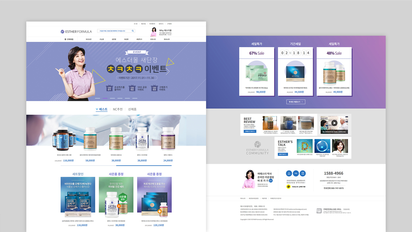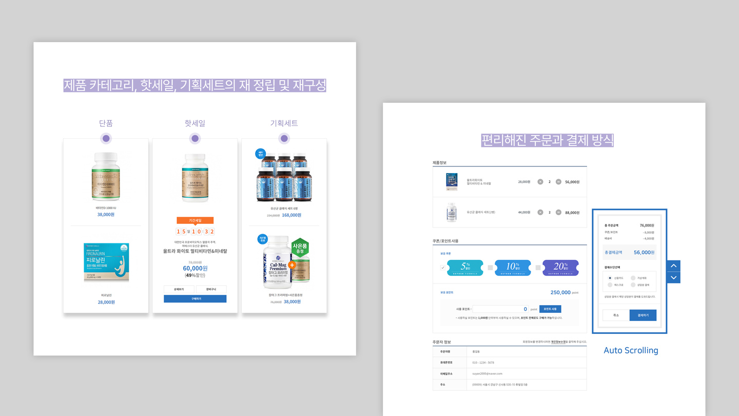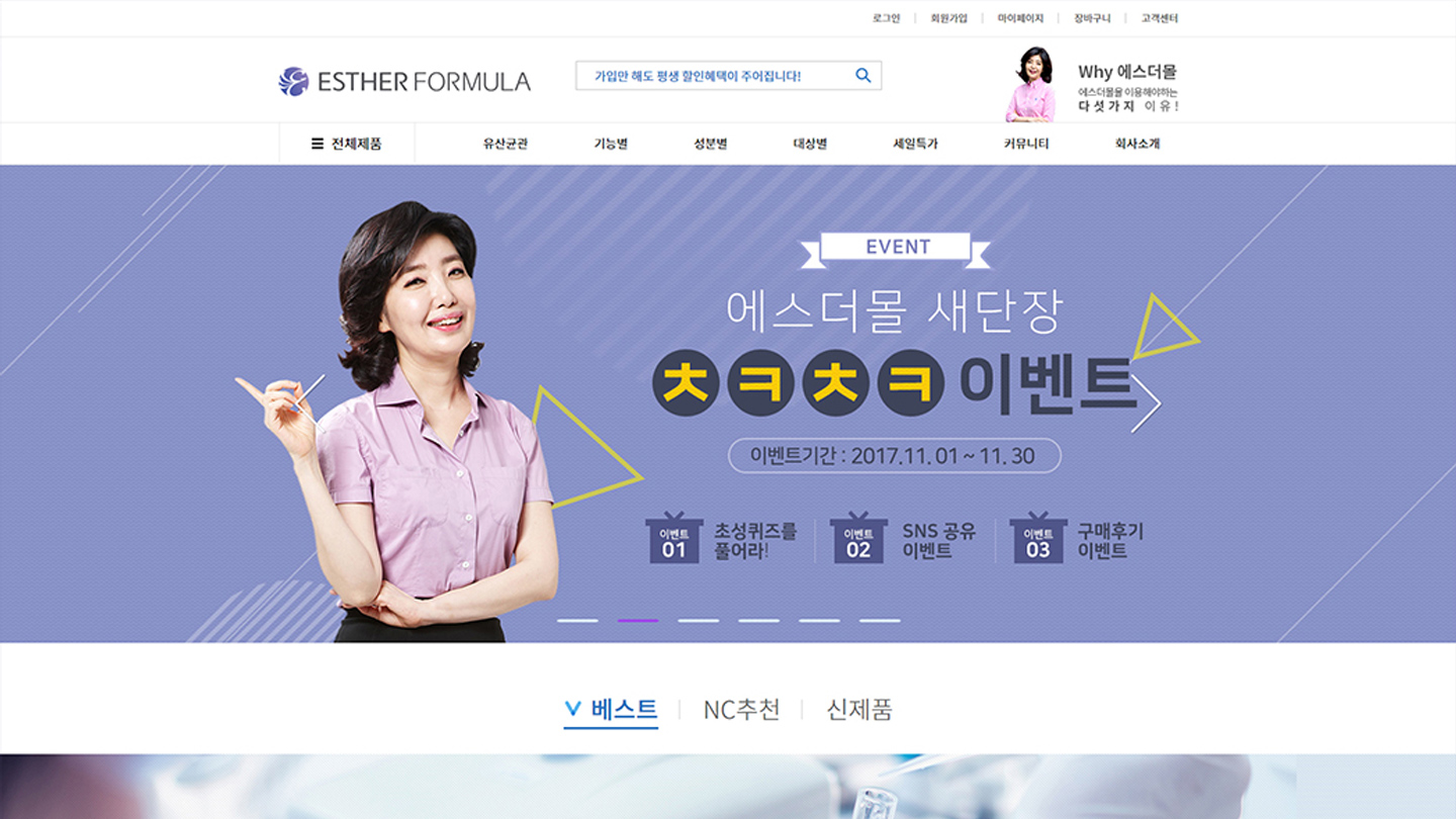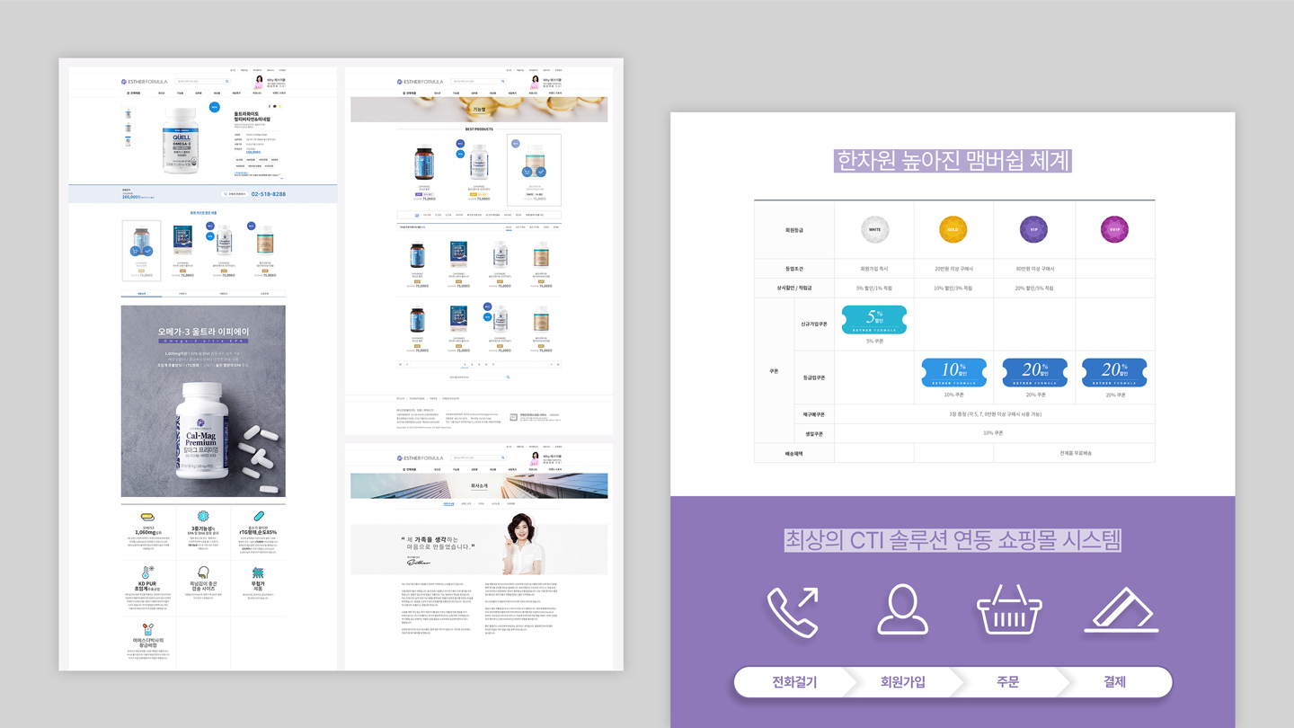 COMPANY 회원이 되어 프로젝트를 등록하세요. 로그인 회원가입 Project 에스더몰 TV 홈쇼핑의 높은 수수료와 자사 회원 확보를 위한 자사몰의 브랜드 파워를 구축하고 건강관련 식품 카테고리 최고의 브랜드로 확고한 자리를 점유하는 쇼핑몰로 구축/운영 DESIGNPOP 클라이언트. 에스더포뮬러 제작사. 디자인파 론칭일. 2019.03 URL. https://www.esthermall.co.kr 이 프로젝트의 하이라이트 더 보기 + 개요 TV 홈쇼핑의 높은 수수료와 자사 회원 확보를 위한 자사몰의 브랜드 파워를 구축하고 건강관련 식품 카테고리 최고의 브랜드로 확고한 자리를 점유하는 쇼핑몰로 구축/운영 목적 / 취지 초기 다양한 제품군이 없는 상태에서 판매전략을 통한 판매상품의 형식을 갖추고, 여에스더 박사의 이미지를 돋보이게 하는 전략으로 쇼핑몰을 개발 특징 건강보조식품을 찾는 방법과 현재 복용하는 의약품과 문제가 없는지 확인하는 창구를 정확하게 기획하여 소비자로 하여금 신뢰감 있는 건강보조식품의 브랜딩을 강화함 디자인팝의 최신 프로젝트 정보입니다. 힘펠몰 기아대책 MAJOR GIFTS SK signet 반응형 웹사이트 반야트리 해운대 부산 경일감정평가법인 아르네코리아 리솜리조트 통합 웹사이트 에스더몰