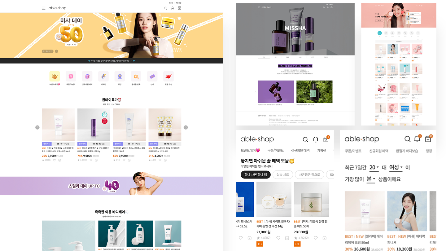 에이블씨엔씨가 보유하고 있는 6개 브랜드 (미샤, 어퓨, 초공진, 스틸라, 셀라피, 라포티셀)의 통합 D2C몰을 구축하고, 상품추천/검색/CRM 마케팅 등 다양한 기술을 통해 고객에게 최선의 구매경험을 제공합니다.