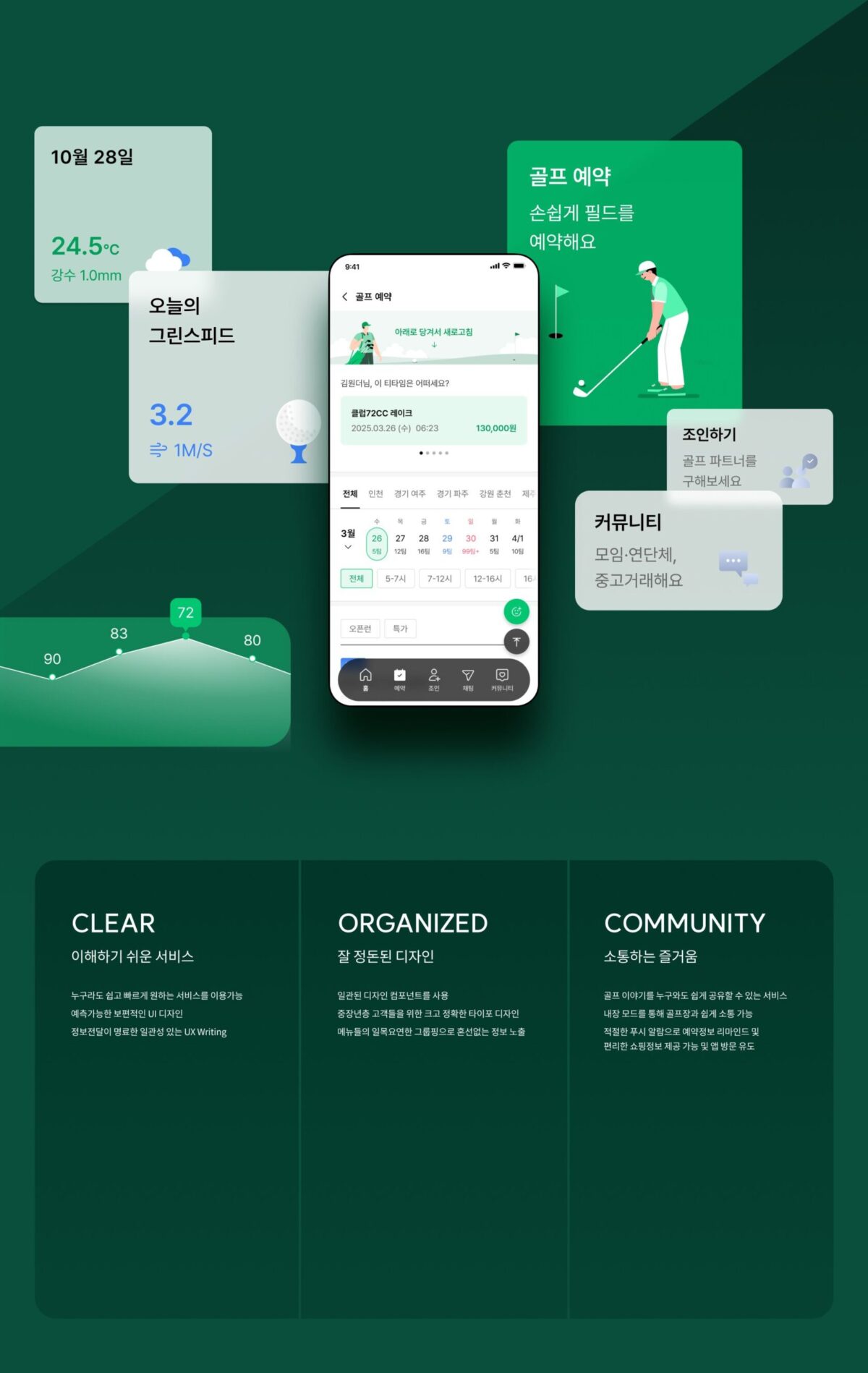 원더클럽 모바일은 “골프 예약” 중심의 기존 앱을 “소셜 네트위킹 중심의 골프 네트워크”로 확장한 리뉴얼 프로젝트로, 예약, 조인 커뮤니티, 소핑 등 골프 문화의 새로운 연결 경험을 제시합니다.