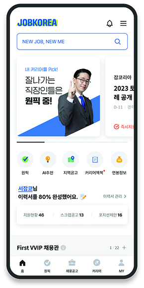 사용자들이 많이 선택하는 메뉴만 탭바에 노출해 직관적으로 재구성하기도 했다. 모바일 앱으로 더 빠르게 채용 공고를 확인하고, 이력서 작성과 입사 지원도 간편하게 끝낼 수 있다. 500만 이상 사용자가 선택한 잡코리아 앱을 직접 사용해보길 권한다.