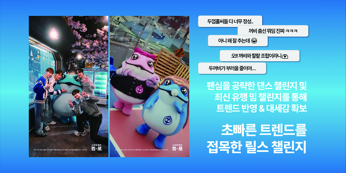 MZ 취향 저격 두꺼비와 함께 경험하는 초깔끔한 맛! 진로는 캐릭터를 중심으로 다양한 경험을 추구하는 ‘캐파민(캐릭터+도파민)’ 트렌드에 맞춰, 인스타그램에서 스타 두꺼비 세계관을 지속적으로 확장해 나갔다. 견고한 팬덤을 보유한 두꺼비를 활용해 유행하는 밈 패러디와 챌린지 등 다양한 콘텐츠로 소비자와 적극적으로 소통하며 즐길 수 있는 장을 마련했다.