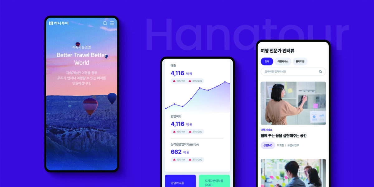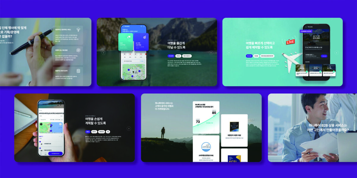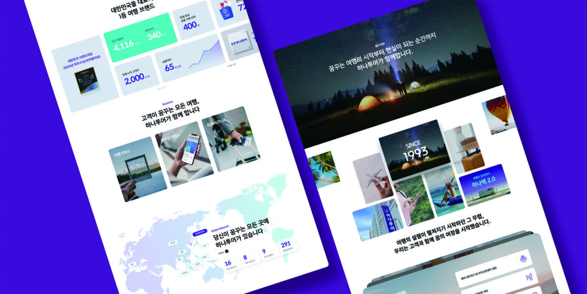 코로나 이후 시대의 여행 산업을 선도하는 하나투어는 리브랜딩 및 사업 변화에 따라 기업 가치를 효율적으로 전달할 수 있는 웹사이트 구축을 목표로 했다. ‘하나투어와 함께 새로운 경험과 가능성이 펼쳐진다’라는 메시지를 중심에 두고, 직관적인 정보 전달을 고려한 레이아웃, 임팩트 있는 영상과 모션 효과, Royal Violet 키컬러를 적용해 젊고 역동적이며 신뢰할 수 있는 기업 이미지를 강화하고자 했다.
