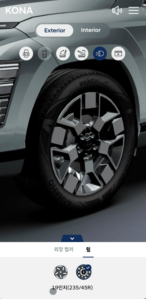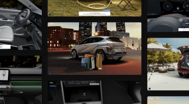 가상의 스튜디오를 Web GL로 제작하기 위해 기존과 다른 여러가지 문제를 해결해야했습니다. 코나의 미래지향적인 디자인과 퀄리티를 유지하면서 어러가지의 기능과 컬러를 하나의 디지털 스튜디오에 담아야했지만 3D의 용량이 커질수록 로딩 속도는 늘어나고 사용자 디바이스의 성능에 따라 퀄리티에 대한 한계 설정도 필요했기 때문입니다. 수많은 R&D를 통해 차량의 폴리곤을 효율적으로 압축하고 카메라 앵글에서 보이지 않는 모델링은 별도의 최적화 작업을 진행하는 등 수십차례의 빌드와 테스트를 통해 차량의 퀄리티와 자연스러운 경험을 모든 디바이스에서 할 수 있도록 구현하였으며 계산된 카메라의 움직임을 통해 자연스럽게 사용자 경험으로 연결 될 수 있도록 제작하였습니다.