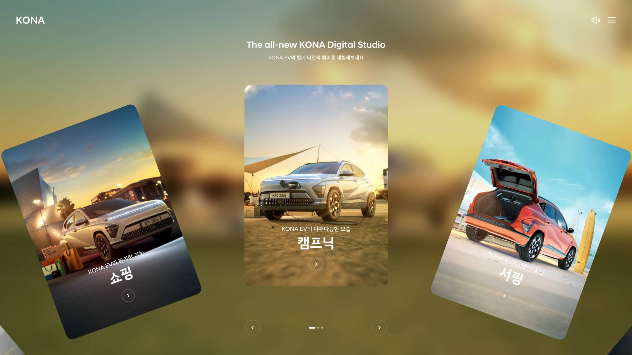 유저가 가지고 있는 디바이스를 통해 코나를 체험한다는 의미로 ‘All New Kona Digital Studio’로 네이밍 하였고 가상의 코나 스튜디오를 만들기위해 Web GL 기술을 통한 인터랙션을 설계하였습니다. 동시에 새로운 기술 속에서 유저의 경험과 감성을 자연스럽게 전달하는 것에 중점을 두었습니다. 그리고 다양한 3D 카메라를 통해 코나의 새로운 기능을 설명할 수 있도록 하였습니다.
