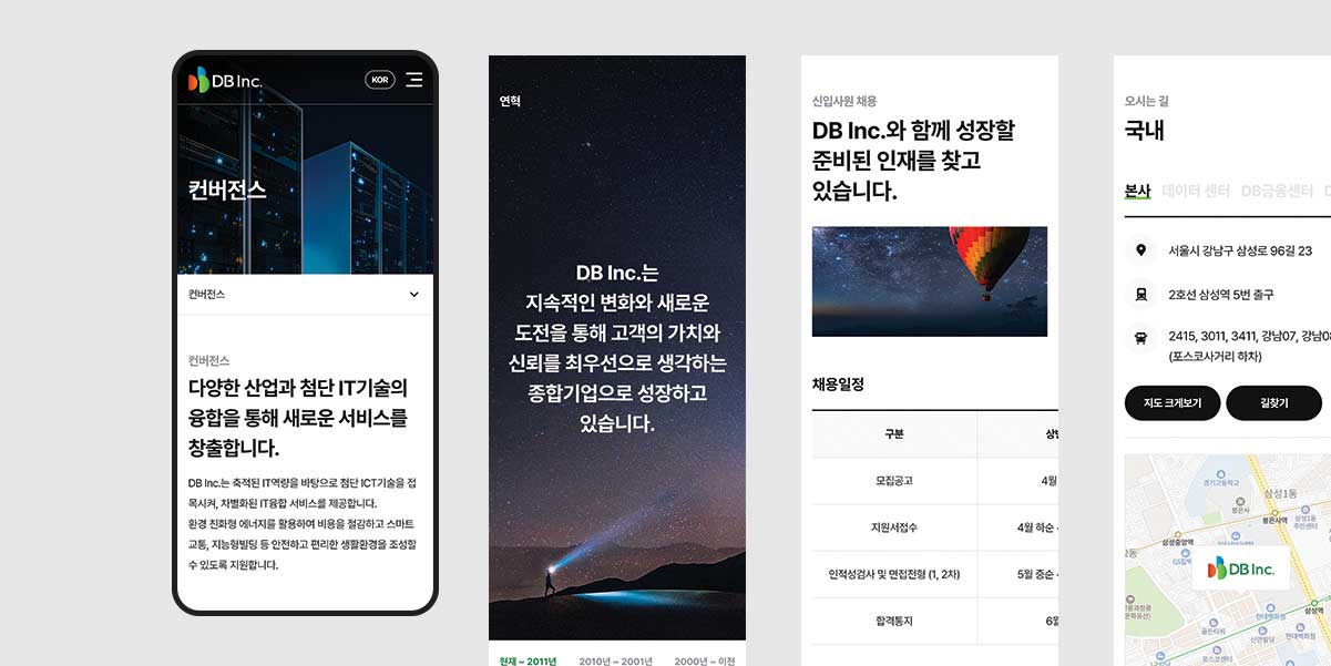 DB Inc.는 새로운 브랜드 이미지를 구축하고 최신 웹 사용 트렌드에 부합하는 웹사이트를 만들고자 개편했다. 주요 정보인 사업 소개 메뉴를 전면에 배치해 DB Inc.의 경쟁력을 홍보하고, 투자 정보와 채용 정보를 정비하며 다양한 방문 목적별 필요 정보를 현행화했다.