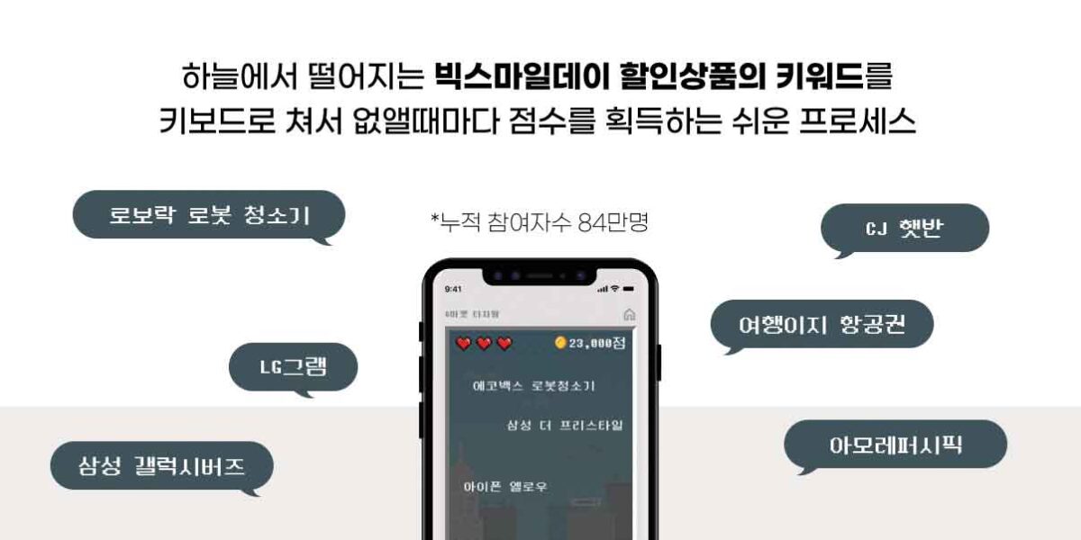 G마켓 연중 최대 쇼핑 축제인 빅스마일데이 기간 신규 트래픽 증대를 위한 바이럴 콘텐츠 개발이 핵심 미션이었다. 누구나 알고, 참여하기 쉬운 ‘레트로 타자게임’을 모티브로 ‘G마켓 타자왕’이라는 게이미피케이션 기반 콘텐츠를 선보였다.