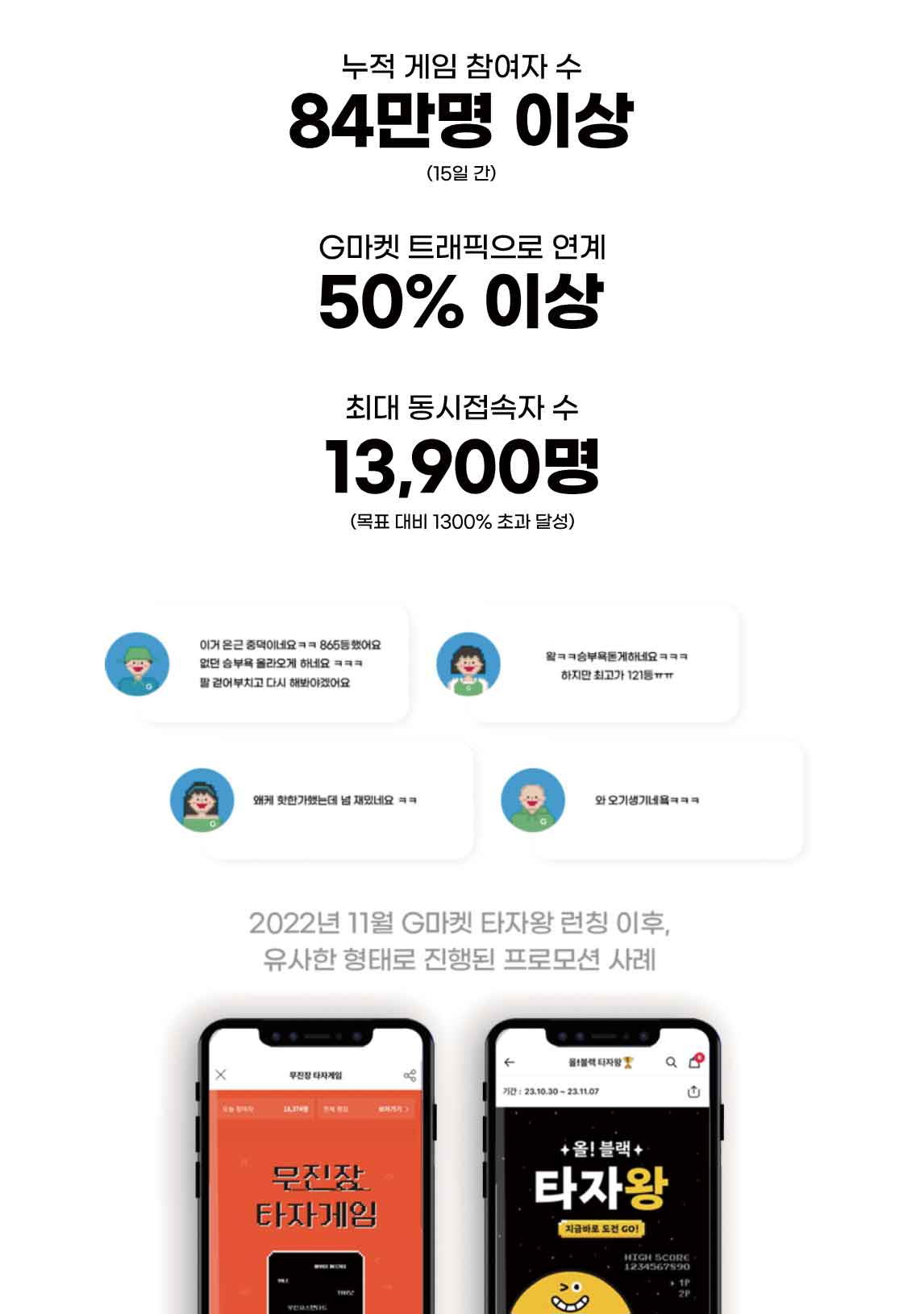 캠페인 기간 동안 약 84만 명이 게임에 참여했는데, 그중 절반 이상이 랭킹을 등록하고 G마켓 트래픽으로 연계되는 성과를 거두었다. 최대 동시 접속자 수 13,900명으로 목표 대비 1300% 초과 달성한 결과다.