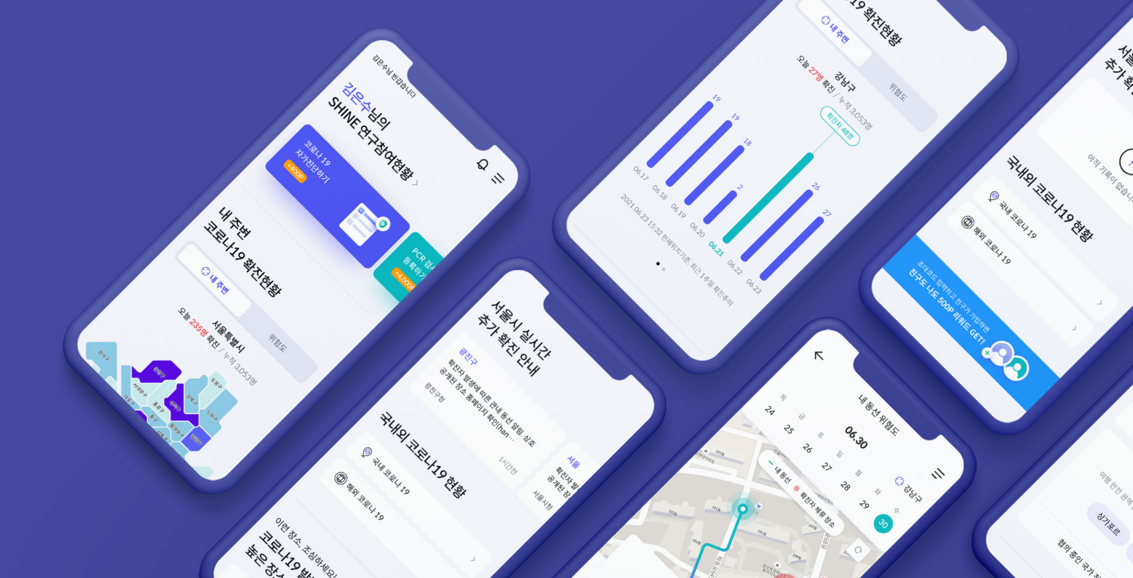 여러군데 흩어져 있던 코로나 정보를 한 눈에 볼 수 있도록 설계하였습니다. 위험도, 추가 확진 등 정보를 확인할 수 있습니다.