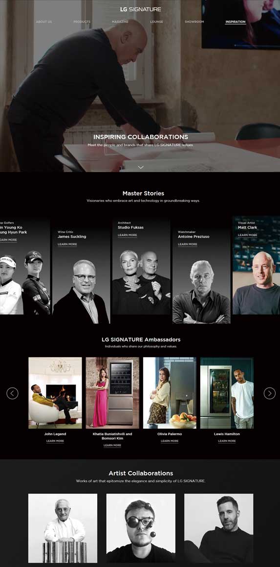 LG SIGNATRE Global microsite는고품질 라이프 스타일의 경험과 감성이고스란히 느껴지도록 하는 데 목표를 두고 제작했다.제품마다 빈틈없이 담긴 수많은 섬세함을하나의 메시지로 통합하는 것을 중점으로 설계했으며,화려한 기술력과 섬세한 기능, 고급스러운 우아함과 명확하고 간결한 디자인을모두 담고자 했다.