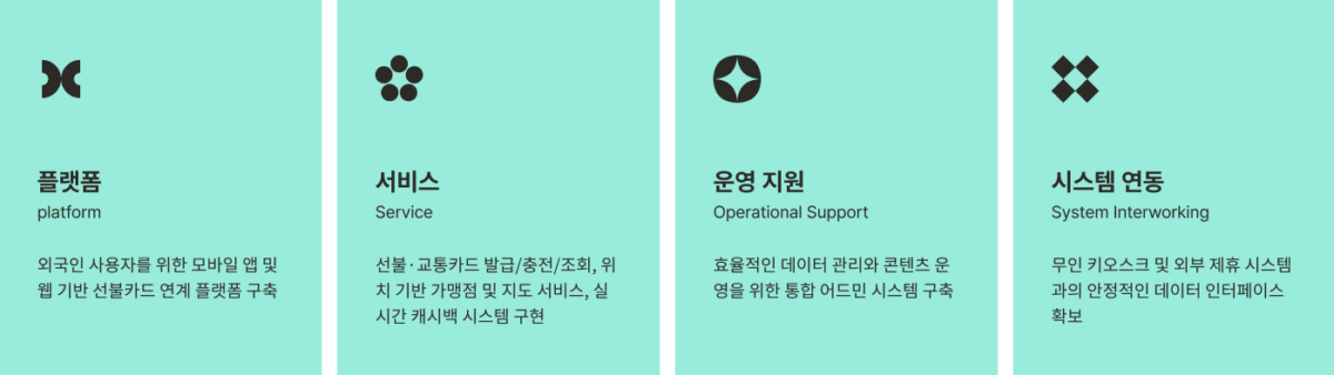 여정의 편리함을 경험할 수 있도록 외국인 관광객 선불카드 연계 플랫폼을 구축 했습니다.