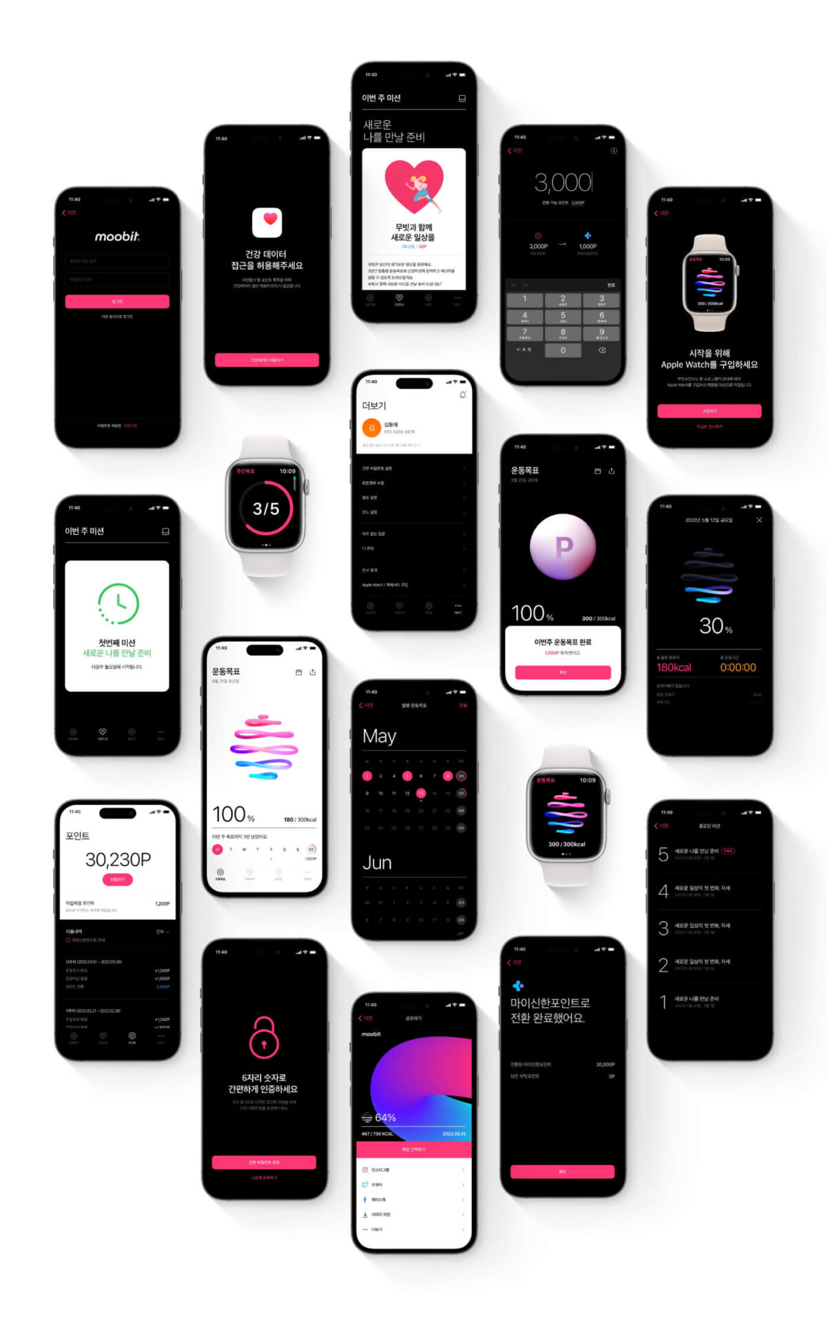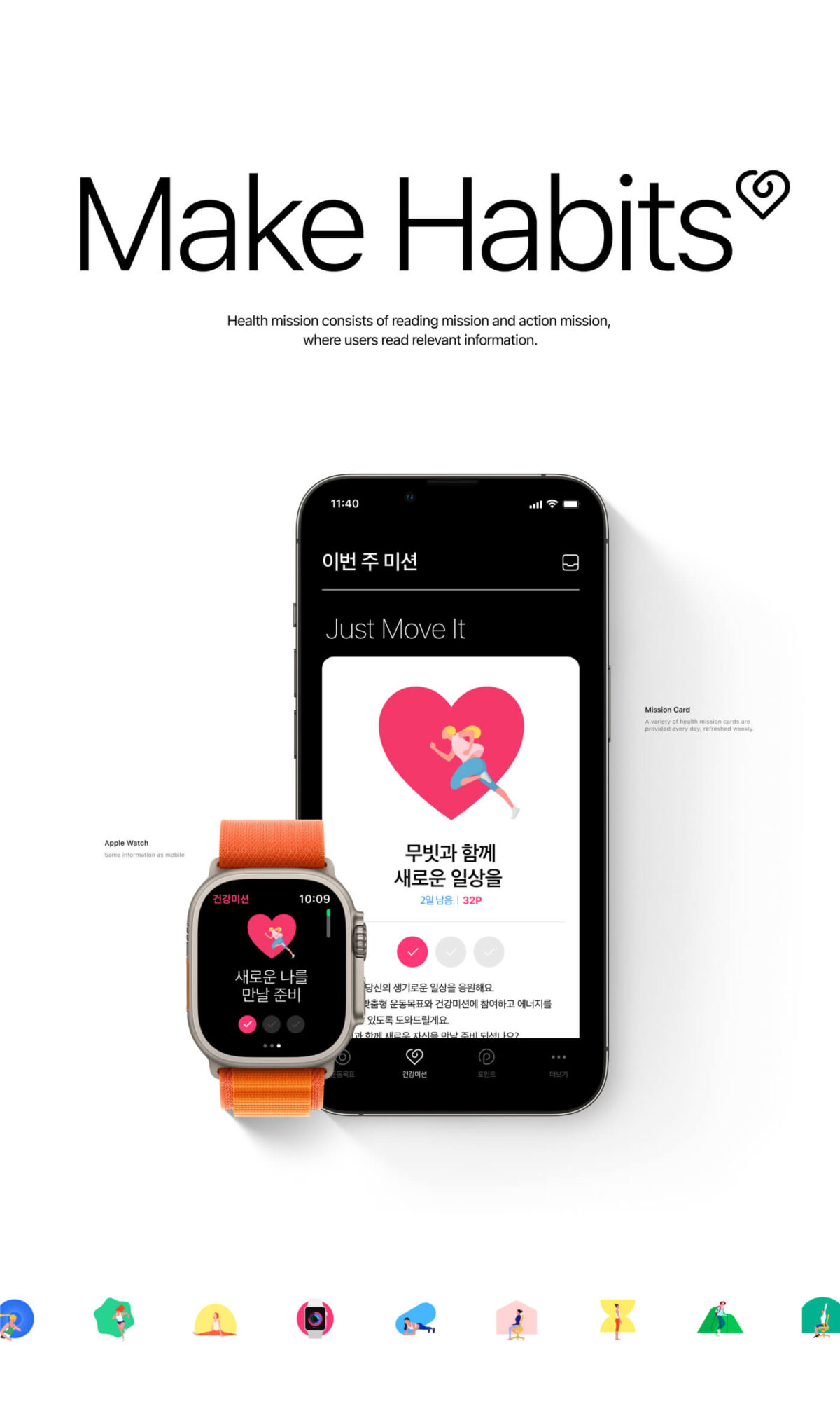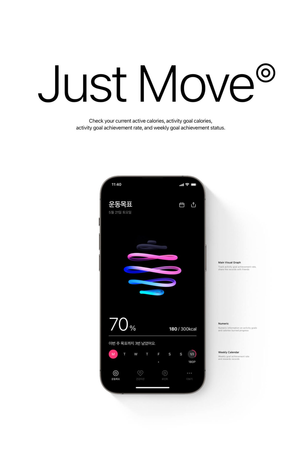 무빗은 Apple Watch와 연동되어 운동 목표를 달성하고, 매주 제공되는 건강 미션을 완료하여 리워드를 받는 헬스케어 앱입니다. 사용자가 운동 목표를 설정하고, 지속적으로 목표를 달성할 수 있도록 UX/UI를 설계했습니다. 앱의 비주얼 아이덴티티는 Apple 피트니스 링을 모티브로한 6개의 입체적이고 다이나믹한 링으로 목표 달성 현황을 직관적으로 보여줍니다. 또한, 운동 미션과 관련된 정보를 일러스트 카드 형식으로 제공하여 건강한 습관 형성을 돕고, 사용자에게 건강 정보를 쉽게 전달합니다. UI/UX, 앱, 웹, BX, 모션, 일러스트레이션, 프로모션 영상 등 전방위적인 디자인을 통해, 무빗서비스의 브랜드 경험을 일관되게 구축했습니다.