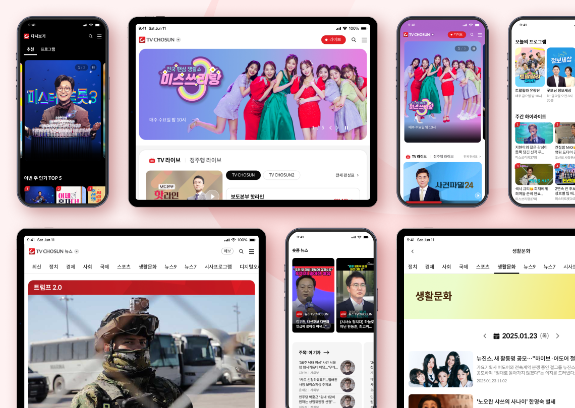 TV조선은 디지털 플랫폼 혁신을 통해 사용자 중심의 경험을 제공하기 위해 웹사이트와 모바일 앱을 대대적으로 개편하였습니다. 이번 개편은 뉴스와 방송 콘텐츠를 통합 제공하며, 콘텐츠 흐름과 이용 구조를 재설계하여 다양한 프로그램을 끊김 없이 시청할 수 있도록 하며 몰입도 높은 사용자 경험을 목표로 삼았습니다.