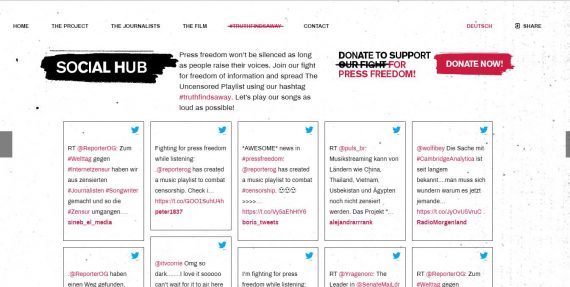 온라인 언론 검열이 극심한 국가의 국민에게 말할 권리를, 제대로 들을 권리를 돌려주기 위한 프로젝트 ‘The Uncensored Playlist(검열 없는 재생 목록)’는 기사를 노래 가사로 풀어내, 그 노래를 음원 공유 서비스를 통해 확산하는 것을 내용으로 삼고 있다. 지금까지 중국, 베트남, 우즈베키스탄, 태국, 이집트의 검열된 이야기가 노래에 담겼고, 일종의 ‘뮤직비디오’ 격의 음원에 대한 부가 설명 영상을 제가끔 촬영해 공개했다. 음원은 스포티파이, 애플 뮤직, 데저(Deezer)를 통해 유통되고 있으며, 영상은 비메오, 유튜브 등을 통해 확인할 수 있다. 자체 웹사이트에도 음원과 영상 모두가 게시돼 있다.