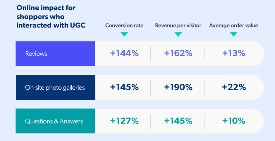 UGC(사용자 생성 콘텐츠)는 전환율, 방문자당 매출, 객단가 모두에 긍정적인 영향을 미칩니다. 특히 사진 갤러리는 전환율을 145%, 매출을 190%까지 끌어올리는 등 가장 높은 효과를 보였습니다.