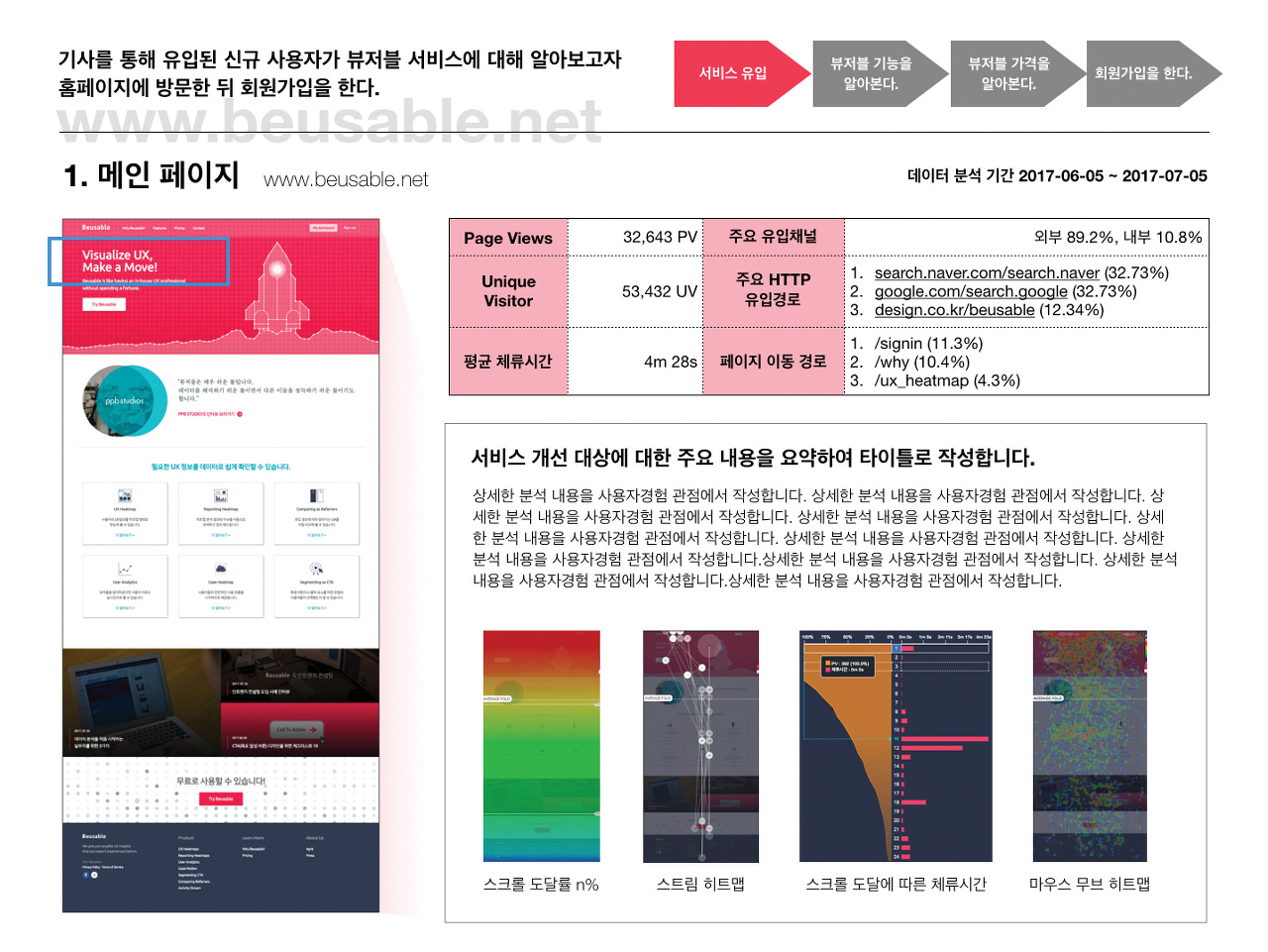 개선을 위한 분석 리포트는 ‘개선’이 최대 목적이자 목표이기 때문에 UX디자인이 주된 내용이며 수치나 행태는 뒤따르는 정보가 돼야 한다. 보통 웹 분석 리포트라 하면 가로 형태의 PPT 화면에 표들이 2~3개 나열돼 있고 하단에 짧은 코멘트가 달려있을 것이다. 하지만 이런 수치나 그래프는 단순 추이, 증감률 밖에 알려주지 못하며 수치에 약한 실무자이거나 유관 부서가 아니라면 크게 관심을 갖지 않게 된다. 서비스 또는 웹사이트의 어떤 부분을 개선해야 하는지 보고하는 리포트는 아래와 같이 작성되어야 한다.