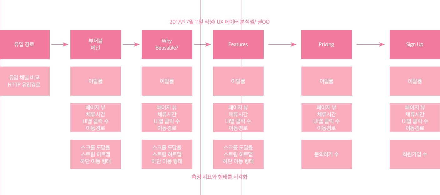특히, 중요한 시나리오에서는 지표의 목표치를 병기한다. 분석을 할 때 수치가 좋고 나쁜지 바로 판단할 수 있기 때문이다. 해당 부분은 빨간색 등으로 눈에 띄게 표시하면 더욱 좋다. 뷰저블은 우측 페이지의 아래 이미지처럼 측정 지표와 행태를 시각화했다. 이렇게 작성하니 웹 분석 프로세스와 진행해야 할 분석 포인트가 무엇인지 매우 명확해지지 않는가?