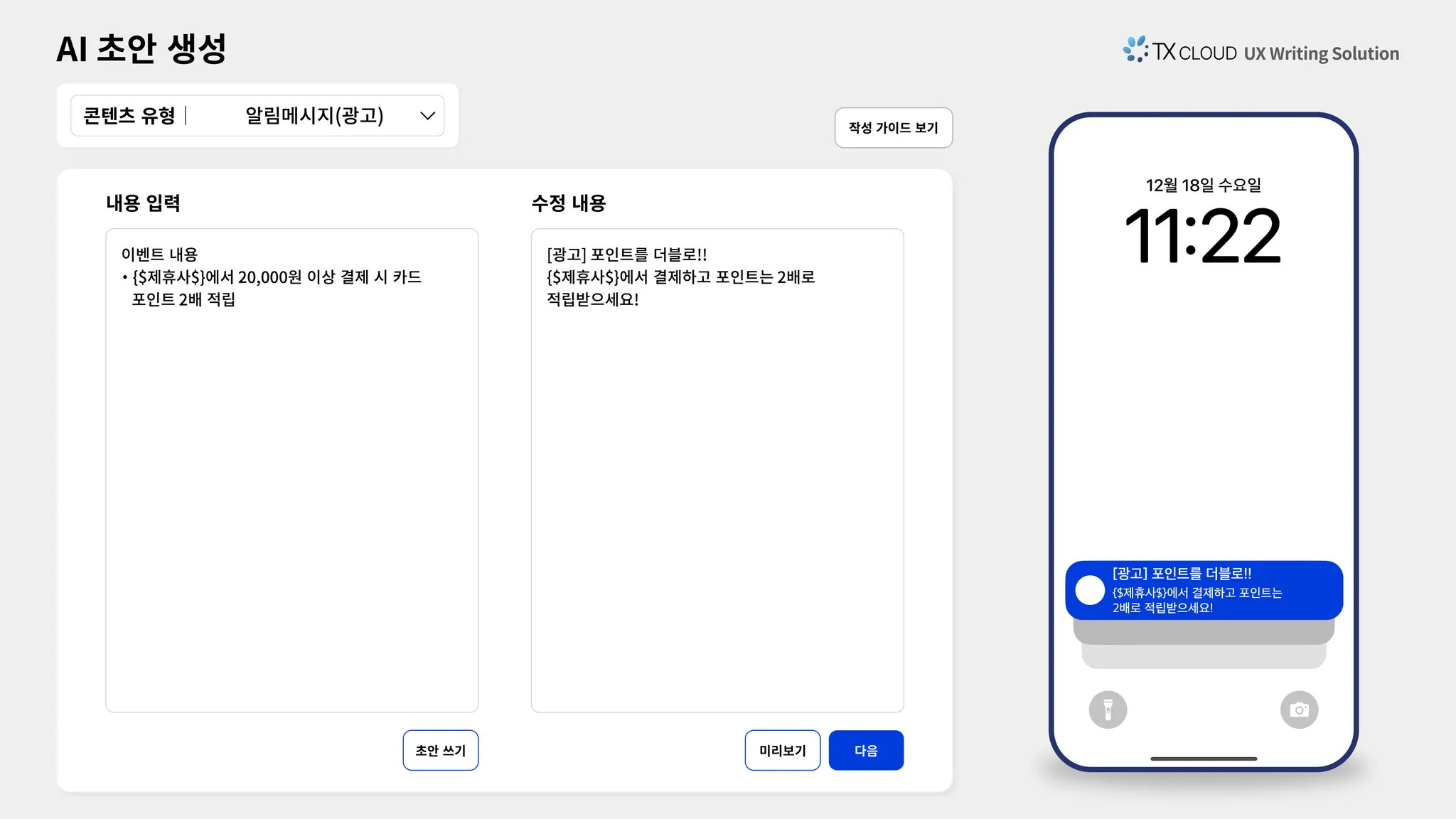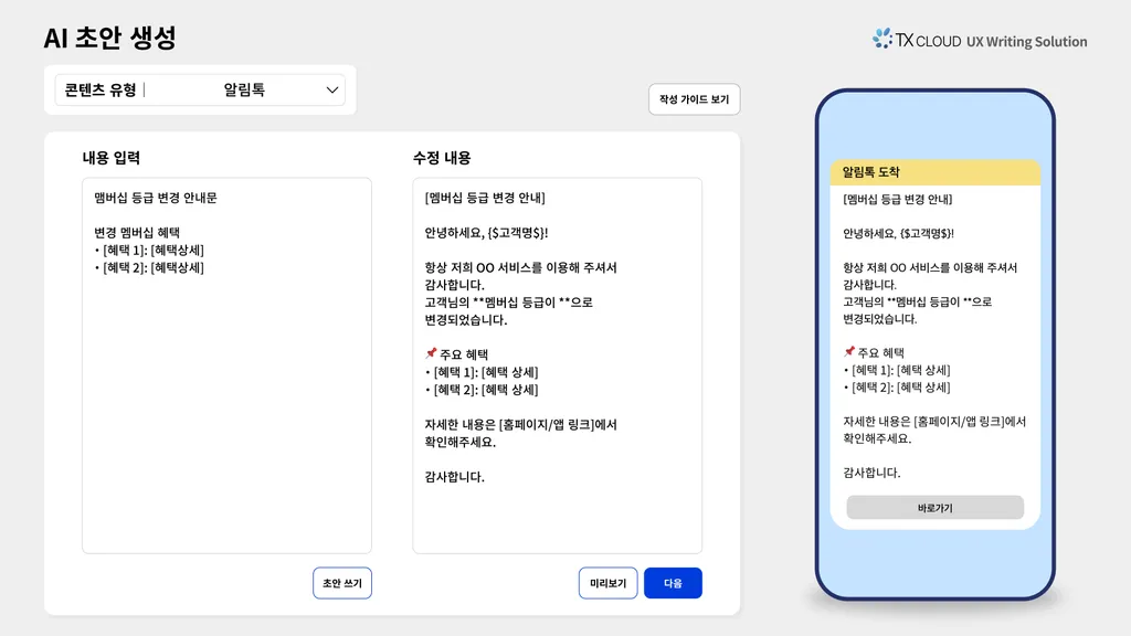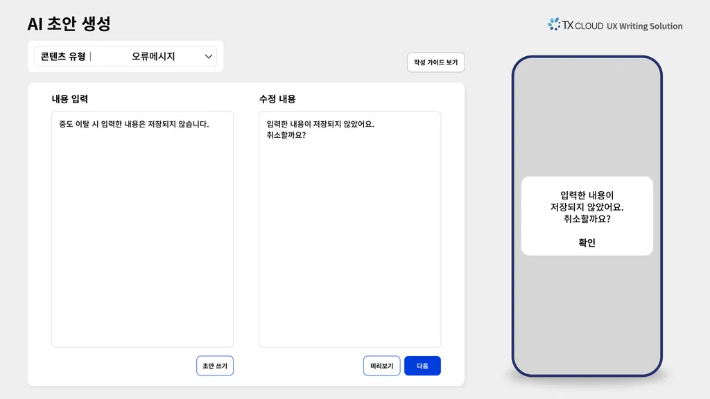 현재 TX 클라우드는 GPT, 클로드(Claude) 등 AI 모델을 UX 라이팅 업무에 활용할 수 있도록 다양한 연구를 진행하고 있다. 현재 개발 중인 주요 기능으로는 AI를 활용한 초안 재작성, 톤 조정, 콘텐츠 유형에 따른 레이아웃 재구성 등이 있으며, 문자열 치환 방식을 개선하기 위해 텍스트 교정 기능에 AI를 결합하는 실험도 진행 중이다.