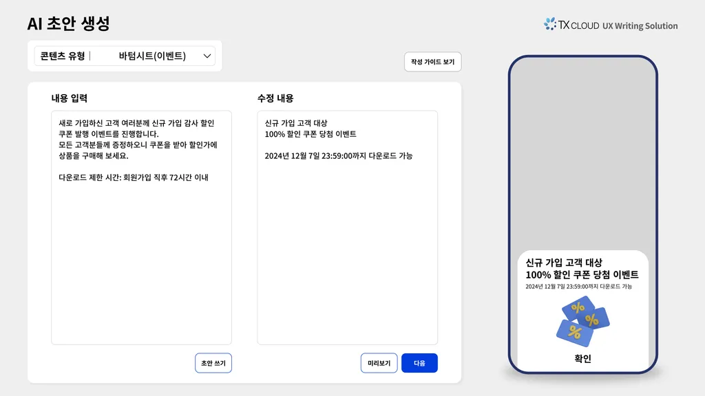 TX 클라우드의 UX 라이팅 규칙 및 스타일 개발 노하우가 집약된 이번 솔루션은 기업의 UX 라이팅 원칙에 따라 텍스트를 일관되게 고쳐준다. UX 라이터는 물론, 기획자나 디자이너 등 사용자 글쓰기에 익숙하지 않은 실무자도 고객 대상 텍스트를 더 쉽고 올바르게 작성할 수 있어 콘텐츠 검수 과정이 간소화될 것으로 전망된다.