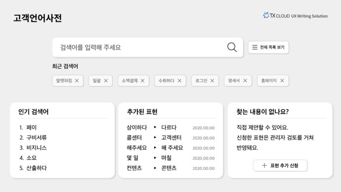 아울러 업계 전반의 UX 라이팅 흐름을 참고할 수 있는 고객언어사전 기능도 제공된다. 와이어링크가 다수의 프로젝트를 거치며 축적한 UX 라이팅 데이터를 가공하여 사용자들이 쉽게 찾아볼 수 있도록 사전 형태로 구축했다.