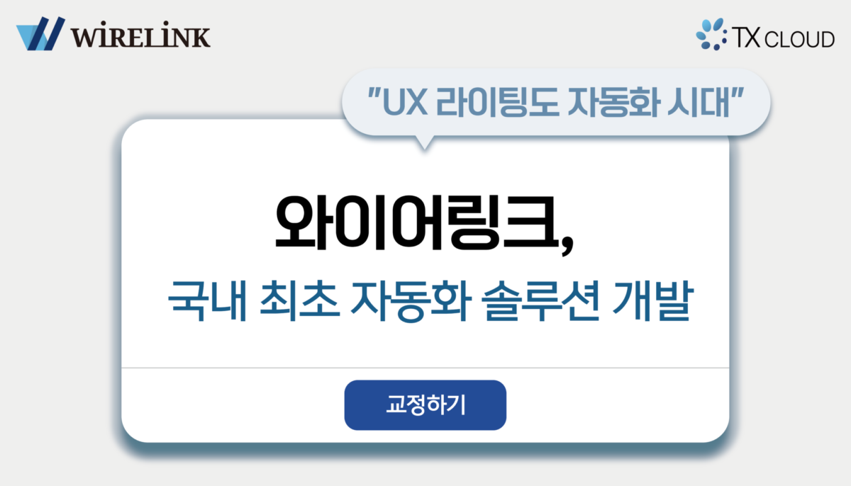 와이어링크가 새로운 브랜드 TX 클라우드(TX Cloud)를 통해 국내 최초 UX 라이팅 자동화 솔루션을 개발했다고 밝혔다. TX 클라우드는 UX 라이팅 서비스 기획 및 고객언어 데이터 구축 전문 회사다.