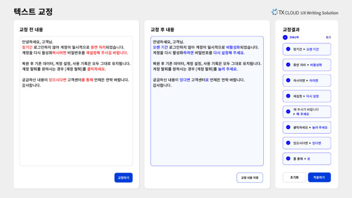 박증우 TX 클라우드 총괄이사는 “국내 최고 UX 라이팅 전문 조직의 노하우가 집약된 이번 솔루션은 텍스트 작성과 교정의 정확성을 높이고, 검수 업무의 효율성을 제고하는 등 고객 경험을 향상하는 데 큰 기여를 할 것으로 기대된다”며 “솔루션을 고도화하기 위한 다양한 방법과 절차를 연구하고 있다. 여러 AI 모델의 결과를 분석해 RAG 기법을 결합하는 방안도 테스트 중”이라고 전했다.