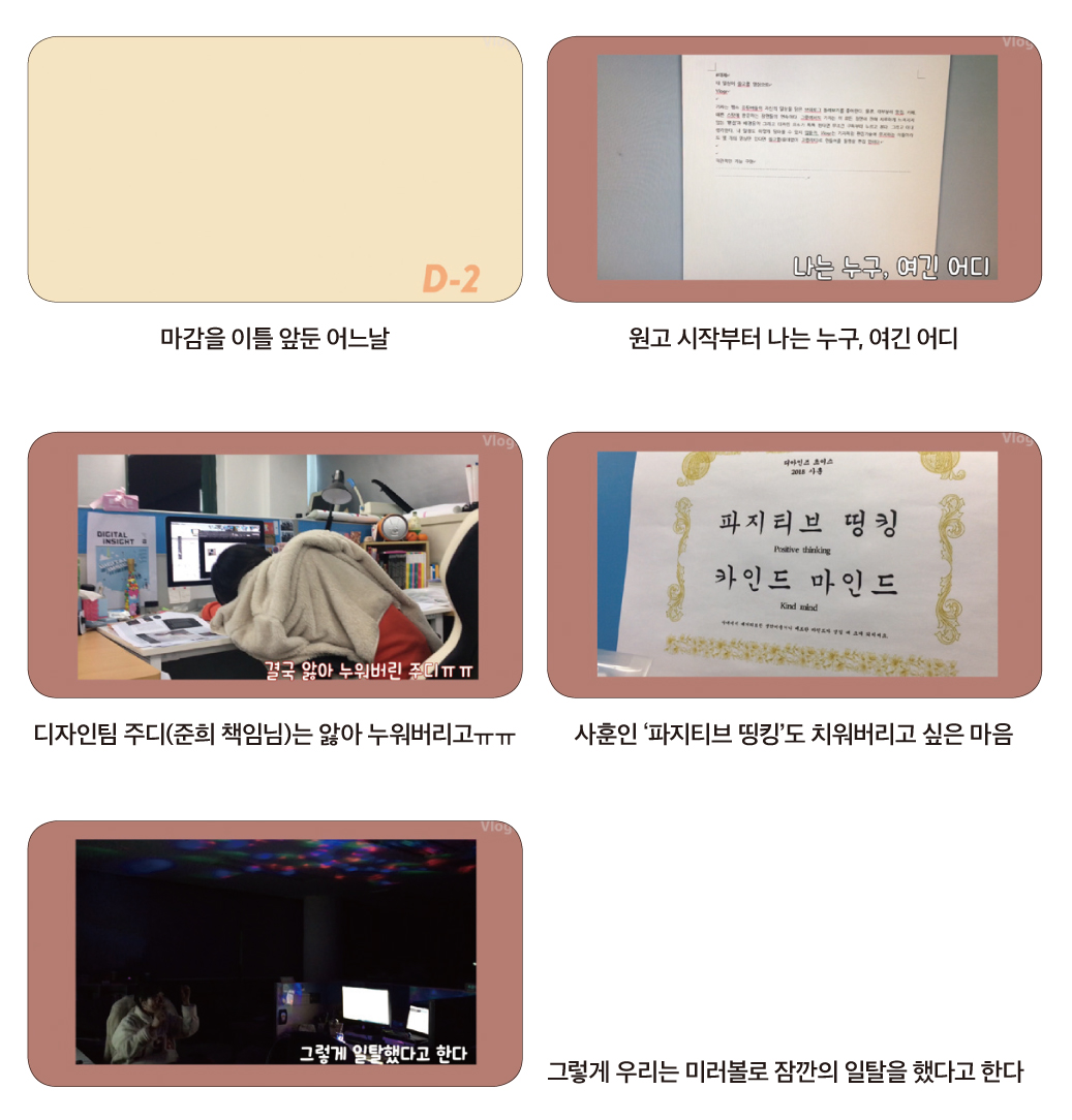 기자는 마감일지뿐만 아니라, 일상에서 담았던 좋아하는 소리들을 모아놓거나 동료들과 함께한 술자리를 찍어 재밌게 연출하기도 했다. 굳이, 널리 보여지지 않아도 자기만족 혹은 함께했던 사람들과의 추억을 쌓기 위해 말이다. 사진첩에 짤막하게 쌓아두었던 영상들을 꺼내 모아보는 것도 좋은 일이다. 그때의 추억들에 지금을 버틸 힘이 나기도 하니까.