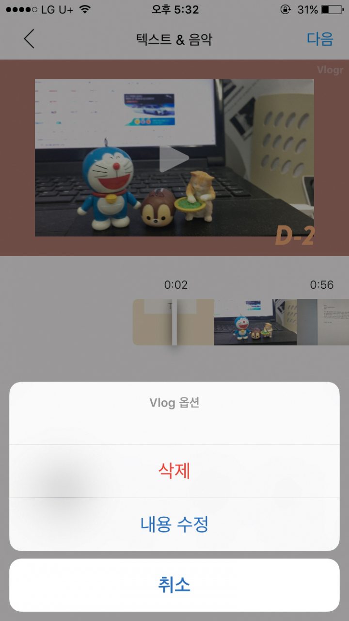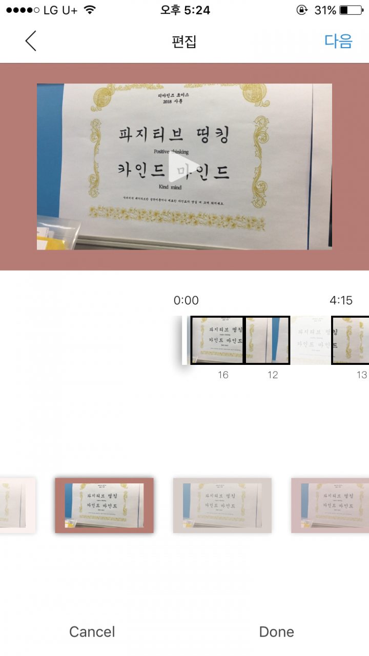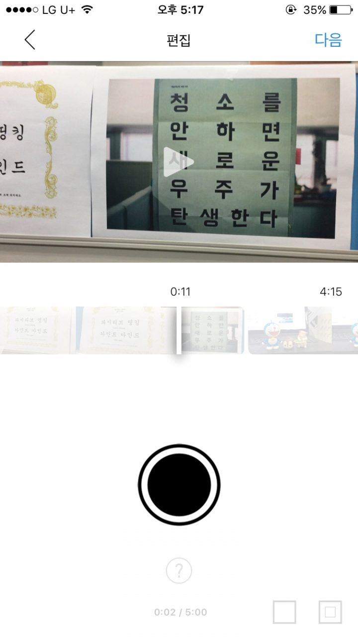 영상은 최종마감 이틀을 남겨놓고 원고와 한 몸이 되어 불태우고 있는 모습들이다. + 버튼을 누르면 사진첩 속 동영상들이 촤라락 등장한다. 여기서 편집하고자 하는 영상들을 선택한다. 이제 원하는 대로 영상을 자르고 이어붙이면 된다.
